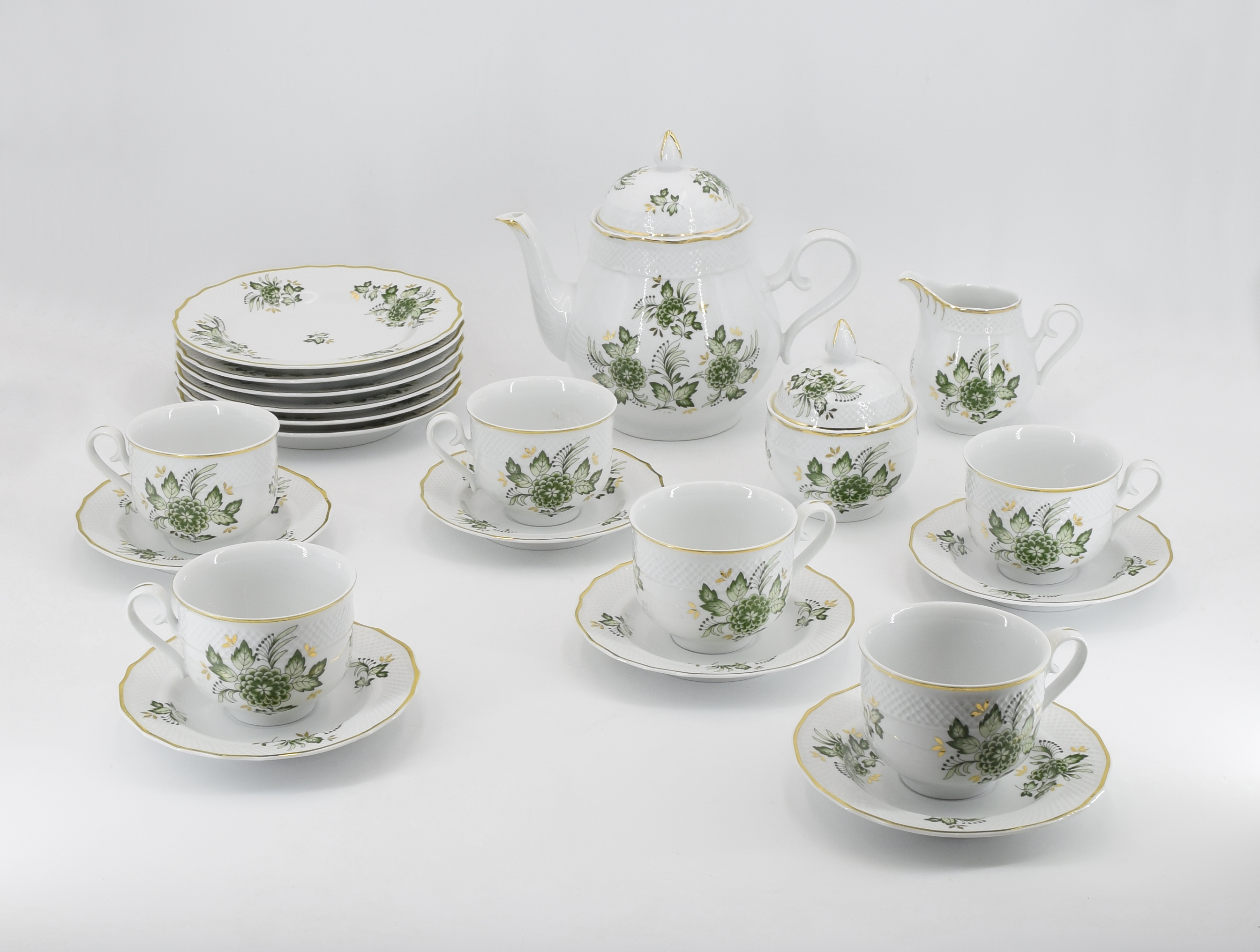 porcelana, druk, złocenie; dzbanek wys.: 20 cm; filiżanka wys.: 7 cm; mlecznik, wys.: 10 cm; cukiernica wys.: 12 cm; spodeczek, śr.: 15 cm; talerzyk, śr.: 20 cm