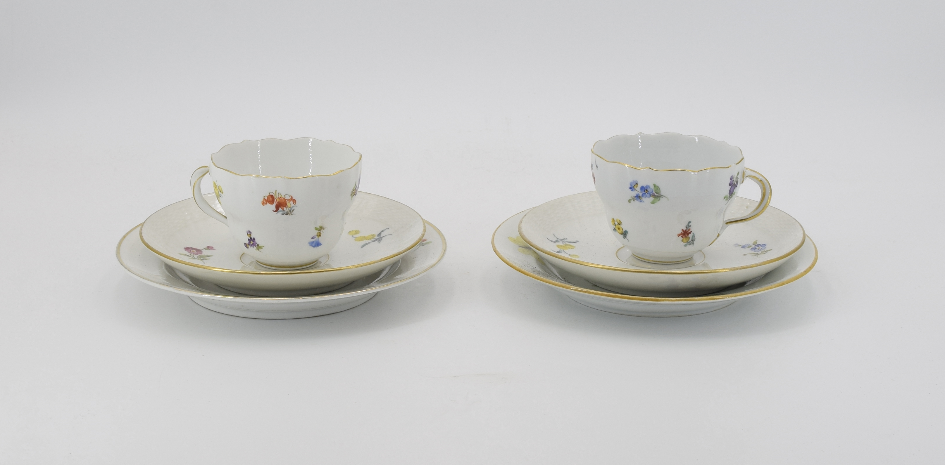 porcelana malowana, farby naszkliwne, złocenie; wym. filiżanki: 6 x 10 x 8,5 cm, śr. spodeczka: 16 cm, śr. talerzyka: 18 cm;