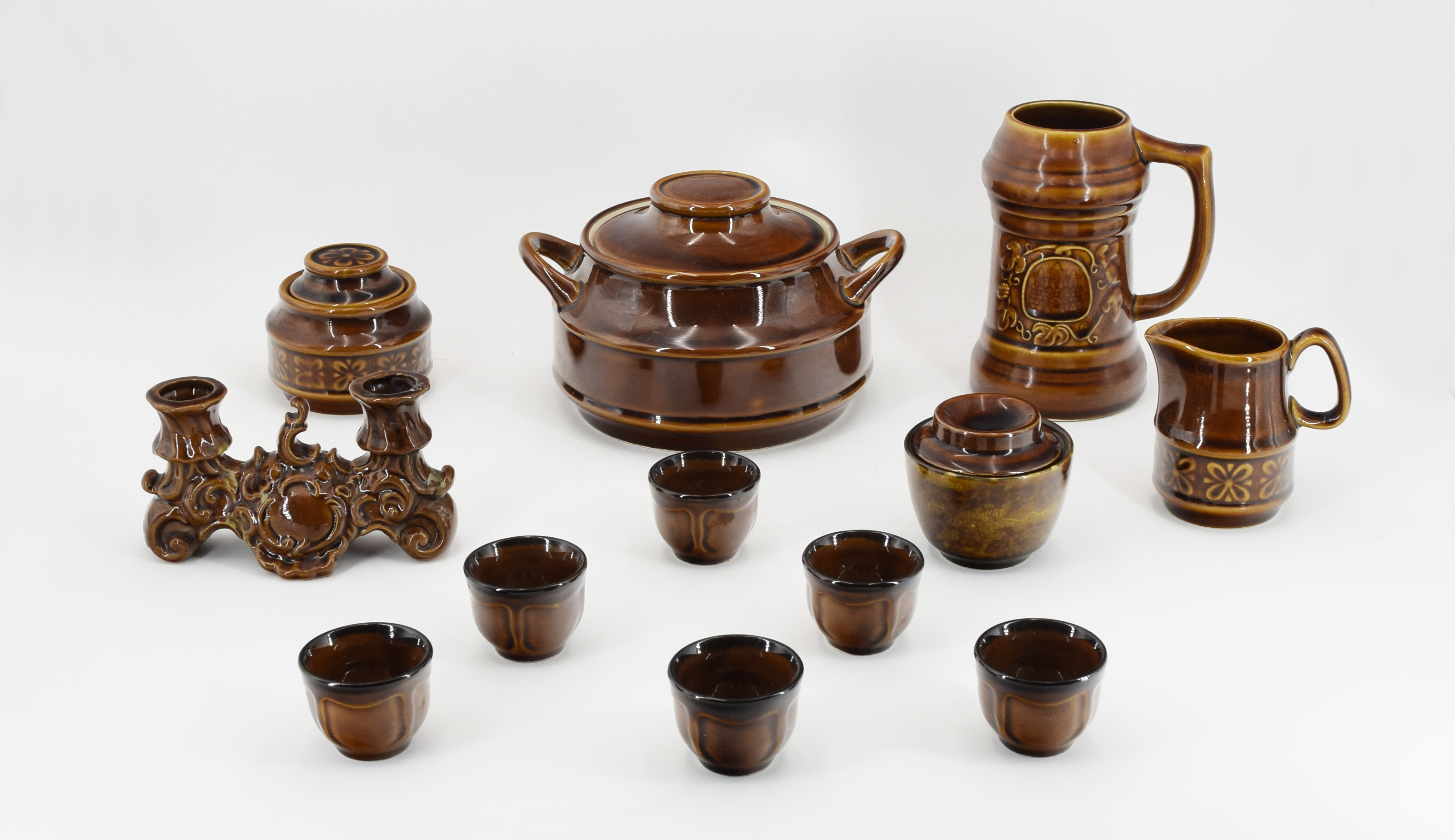 porcelit szkliwiony; wymiary: waza 13 x 21 x 18 cm, mlecznik wys.: 9,5 cm, cukiernica wys.: 8,5 cm, cukierniczka (Mirostowice, z kompletu „Novi”) wys.: 7,5 cm,