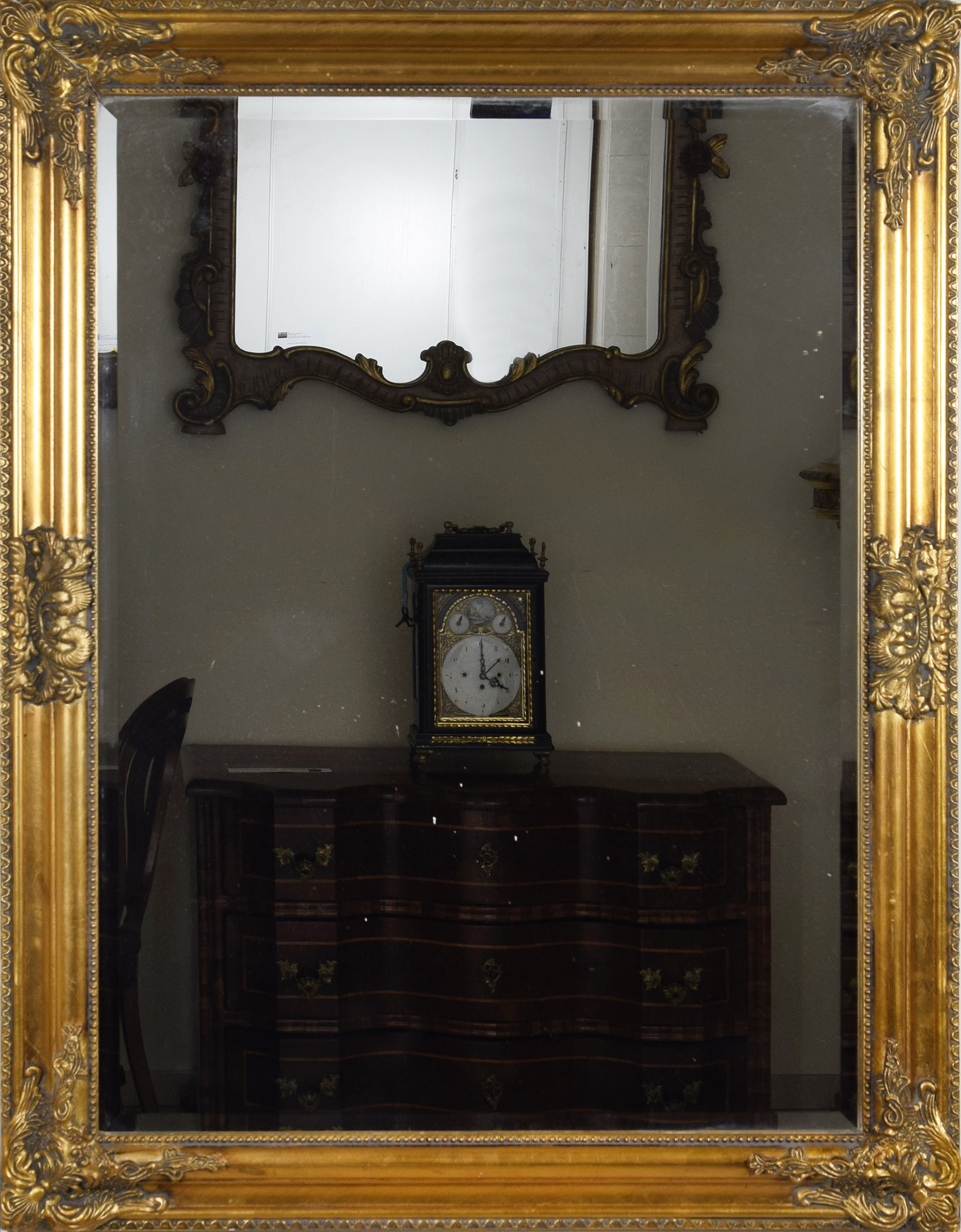 drewno, złota farba, tafla lustrzana; 57,5 x 77,5 cm, 71 x 88 cm z ramą.