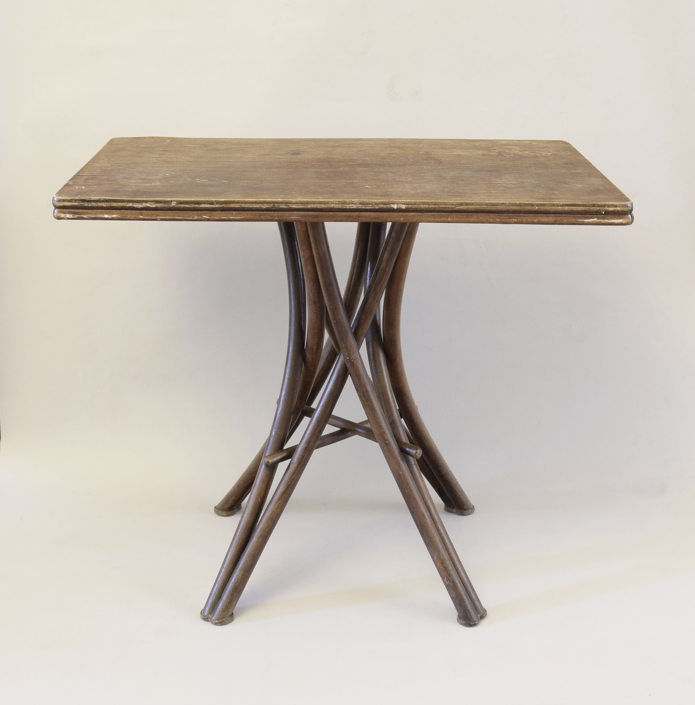 Prostokątny blat z wyoblonymi narożami, nogi w formie imitacji ułożonych w wiązkę gałęzi.