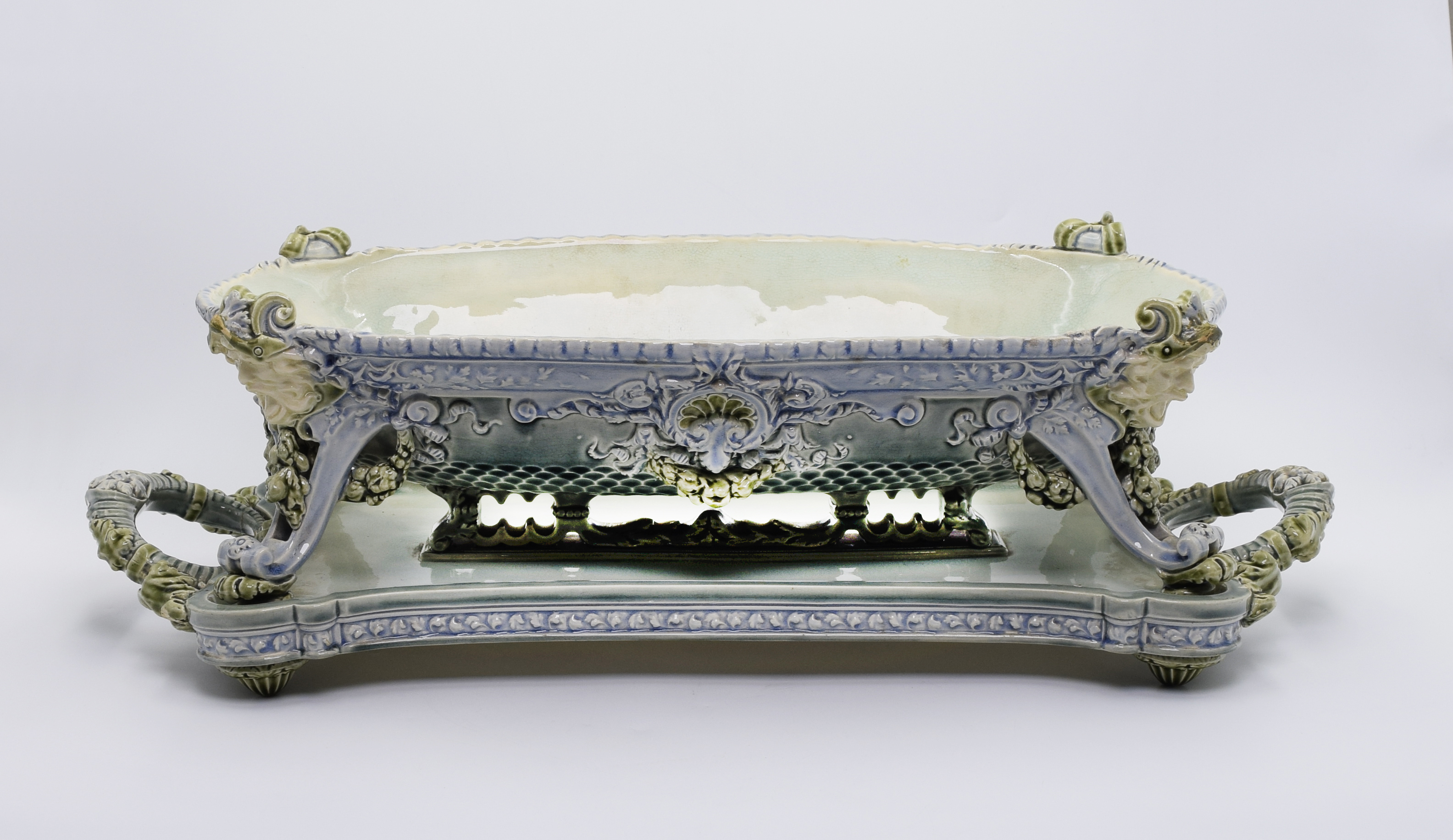 fajans (fajans delikatny), szkliwo ołowiowe (ołowiowo-boraksowe) mącone farbami ceramicznymi (w kolorze seledynowym i zielonym); drobne ubytki przy uchwytach podstawy, ze śladami klejenia; wys. ok. 17,5 cm, podstawa 56 x 24,5 cm; sygn. (od spodu) czarnym drukiem kaligraficzny monogram z nakładających się na siebie liter: Choisy / Le Roi, wzdłuż końca litery „y”: FRANCE, wyciski 1578 (numer formy-modelu?) / P I..? (dalej nieczytelny); Francja, region Ile-de-France, departament Val-de Marne: Choisy Le Roi, wytwórnia fajansu (fajansu delikatnego), k. XIX w. Płytka prostokątna misa o zaokrąglonych narożach, z ukośnie odstawionymi wolutowymi nóżkami i na ażurowej podpórce wzdłuż spodu podstawy; połączona z płaską podstawą na niskich nóżkach, z uchwytami przy krótszych bokach. Dekoracja plastyczna i reliefowa w stylistyce neorenesansowej: cztery maski satyrów, festony owocowe i motywy liści akantu przy uchwytach z reliefową taśmą. Naczynie, określane także jako majolika francuska, powstało w Choisy Le Roi, w latach kierownictwa artystycznego fajansjernią przez uznanego rzeźbiarza i projektanta Louisa - Roberta Carrier-Belleuse’a (po 1889 roku). Carrier-Belleuse był autorem wielu projektów wytwórni, zwłaszcza popiersi ceramicznych i dekoracyjnych wazonów.