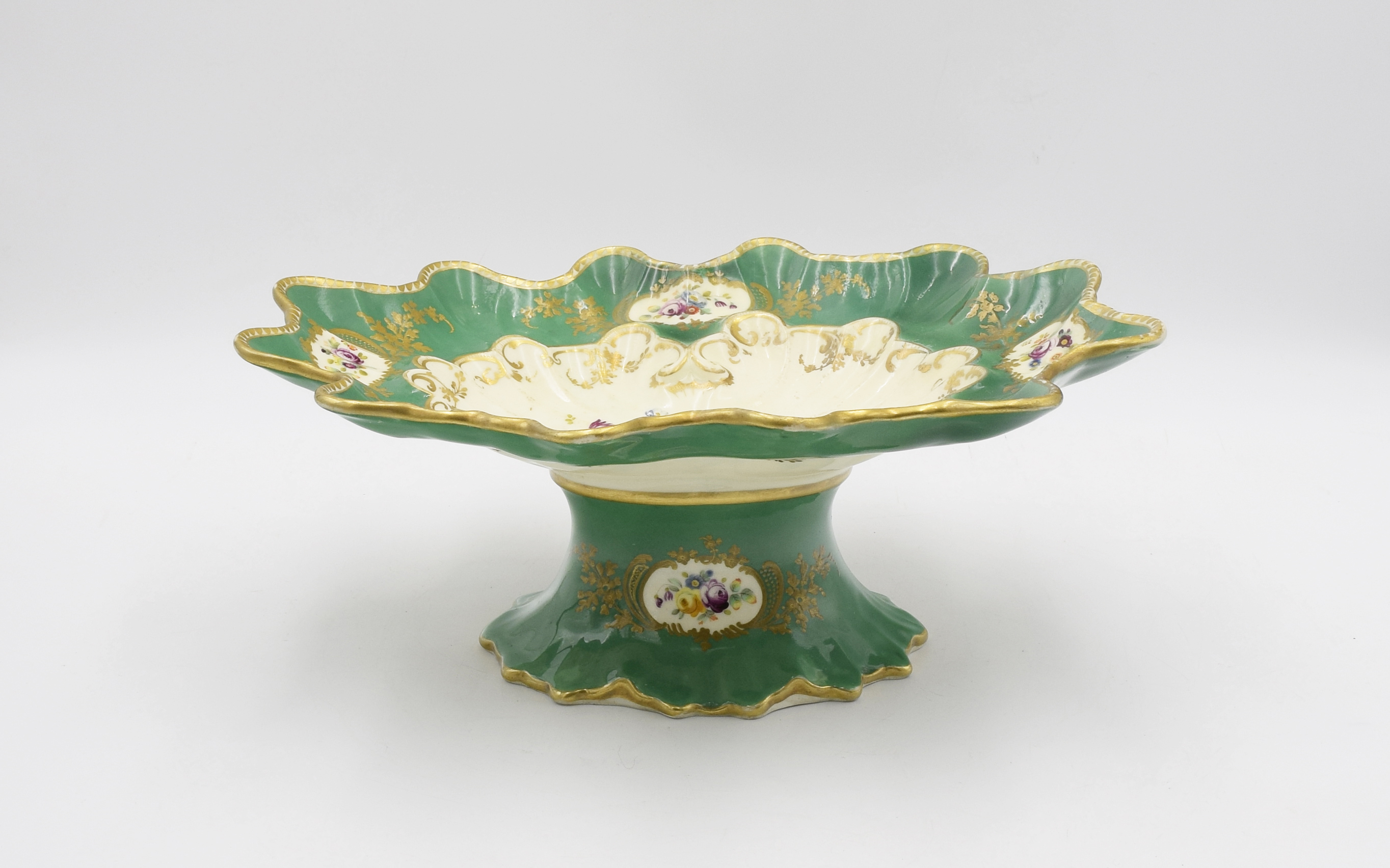 przetarcia złoceń; wys. ok. 14 cm, stopa 17 x 13,3 cm, patera 33,5 x 25,2 cm;