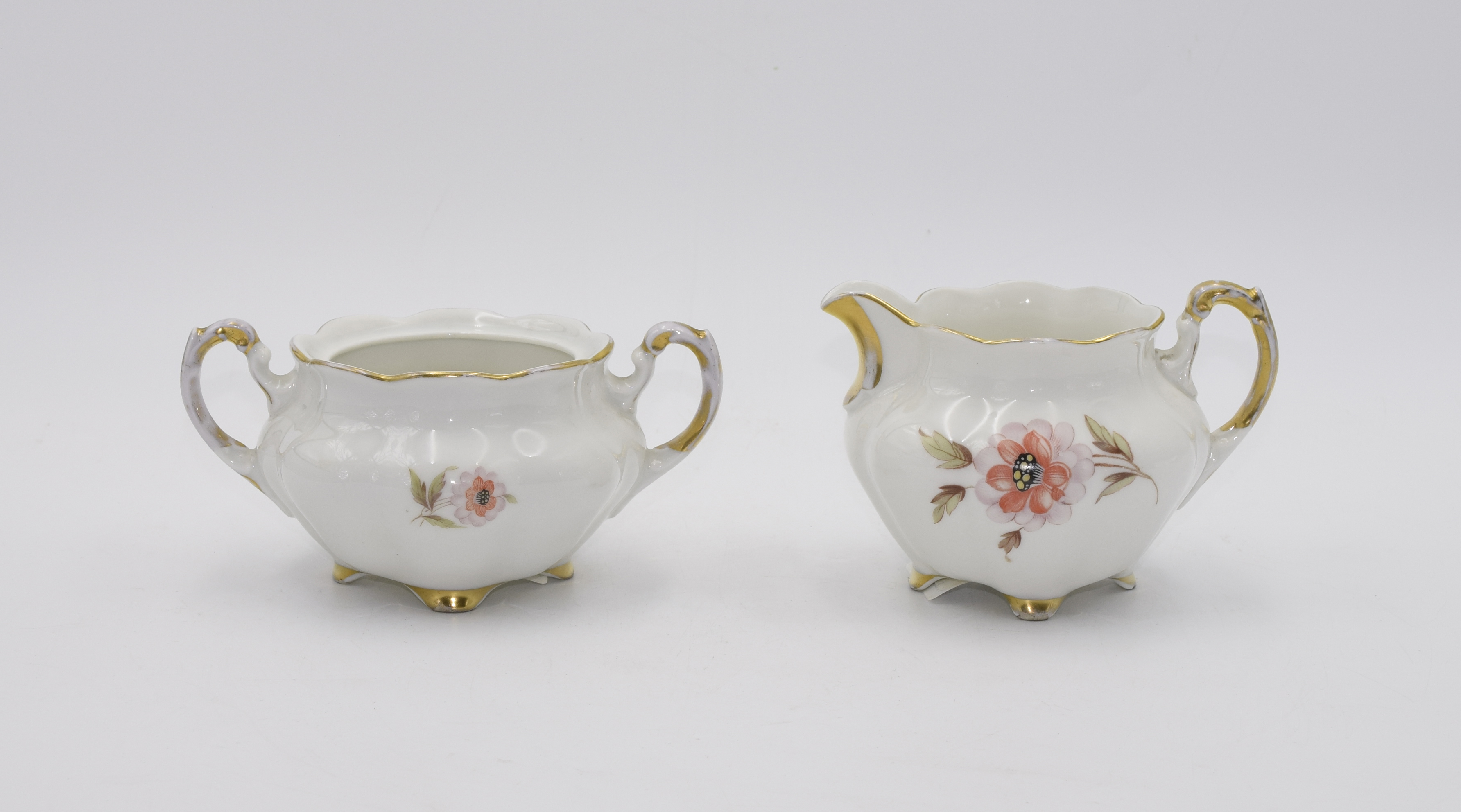 porcelana, dekoracja druk barwny, złocenie; mlecznik wys. 9,5 cm, cukiernica wys. 8 cm;
