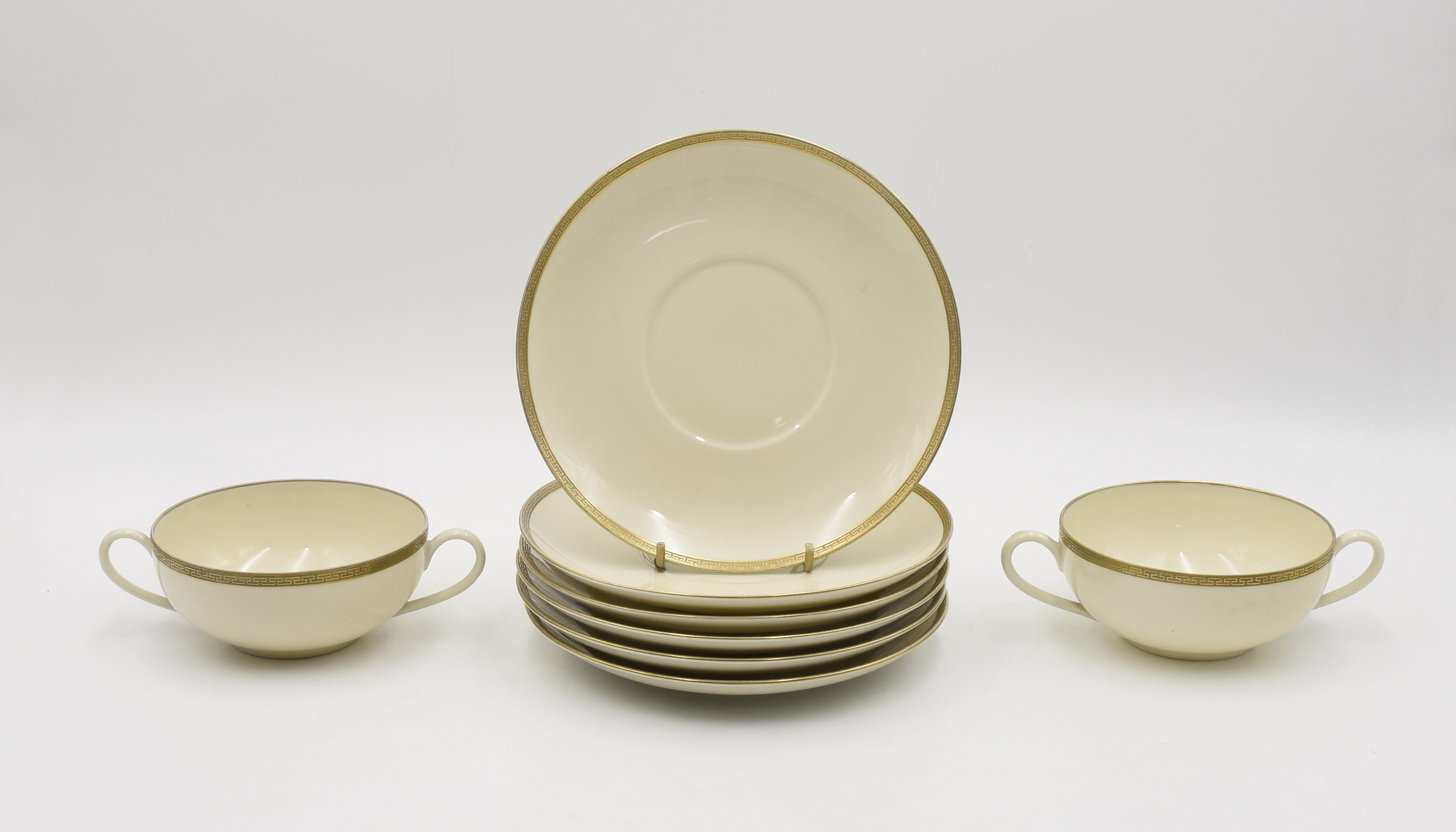 porcelana kremowa, złocenie; bulionówki wym.: 5,5 x 18 x 12,5 cm, talerz śr.: 19,5 cm;