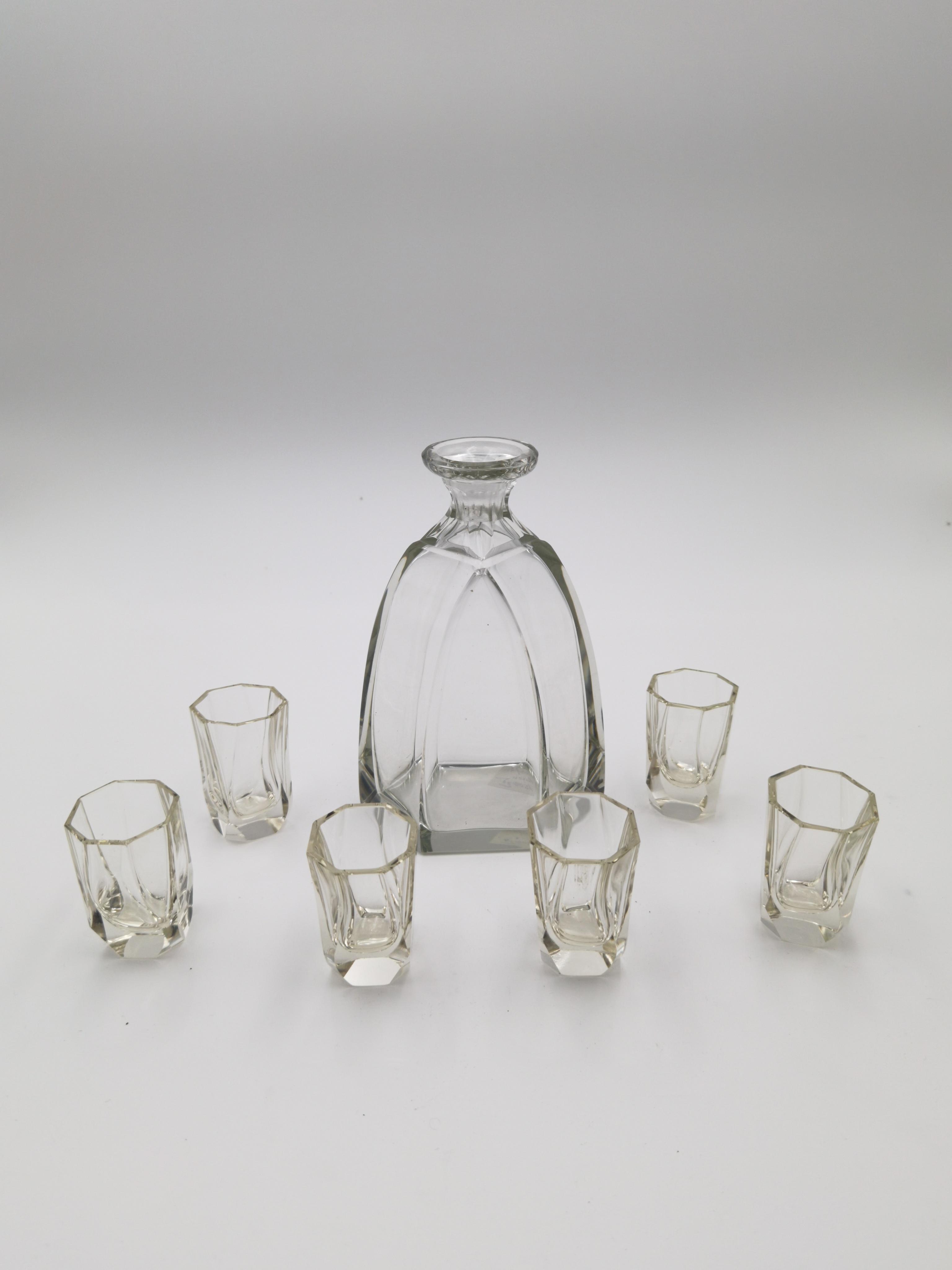 szkło bezbarwne; karafka wys. całkowita: 24,5 cm, kieliszki wys.: 6,5 cm;