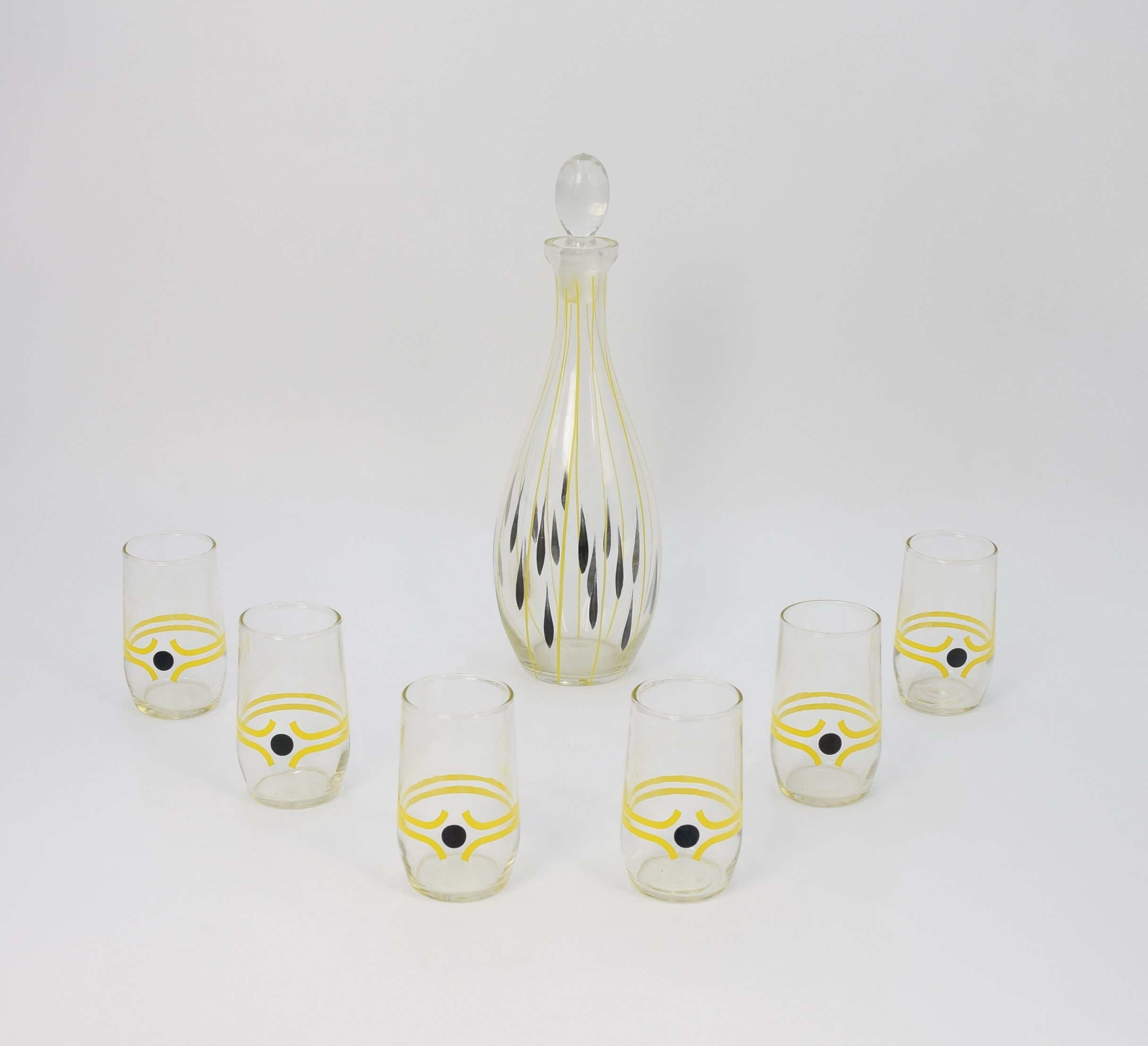 szkło bezbarwne, farba naszkliwna, kalka, wykończenie kapowe; karafka z korkiem: 27 x 805 cm, ozn. na spodzie 68; kieliszki: 8,4 x 4,5 x 4,5 cm;