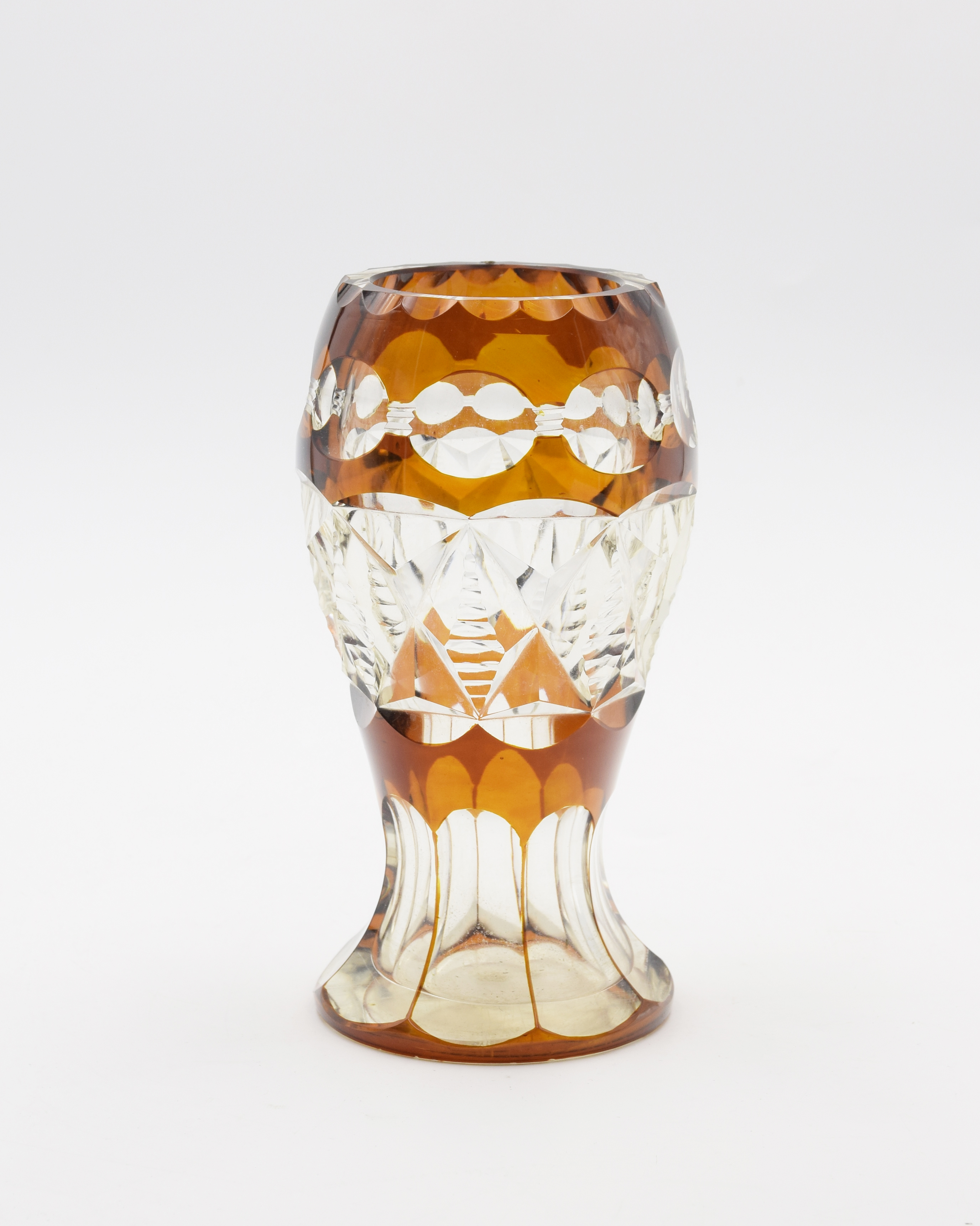 szkło warstwowe, przezroczyste i miodowe, dekoracja szlifowana; wys. 16,5 cm, średn. wylewu 6,7 cm.