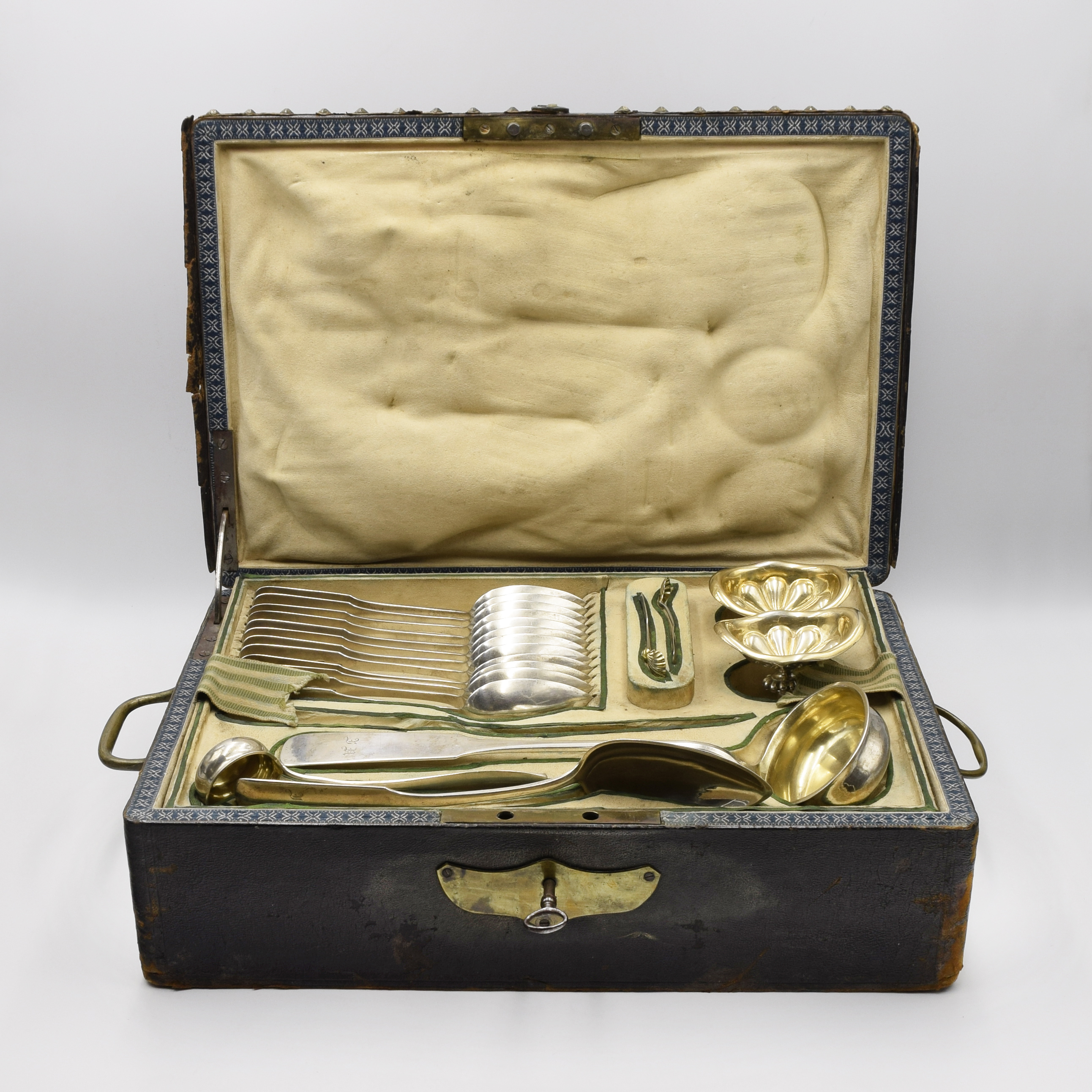 w składzie: 12 łyżek do zupy (dł. 23 cm), 12 widelców i 12 noży do drugiego dania (dł. 22,5 cm i 25,8 cm), 12 łyżeczek do herbaty (dł. 15,5 cm), pary solniczek wewnątrz złoconymi (wys. 6,8 cm, szer. 9,5 cm, głęb. 7,2 cm) z 2 łyżeczkami do soli z muszlowymi, złoconymi czerpaczkami (dł. 10 cm), łyżki wazowej (dł. 30,5 cm) i chochelki (dł. 20 cm) ze złoconymi czerpakami oraz łyżki półmiskowej (dł. 23 cm); srebro próby 84 cechowane, częściowo złocone (Malcz - kursywą w prostokącie, cecha probierni z inicjałami probierza W.K., rokiem 1857, próbą 84 i orłem dwugłowym, znak warsztatowy - kotwica - w owalu, 1 łyżeczka z datą 1859), 1 nóż dobierany platerowy cechowany (NORBLIN / w WARSZAWIE i N w owalu), chochelka z lancetowatym trzonkiem dobierana cechowana (ERadke, 12, znak warsztatowy), stal; waga bez noży: 2871 g. Warszawa, 1857. Sztućce z trzonkami łopatkowymi, z monogramami grawerowanymi w manierze gotyckiej, ostrza noży stalowe cechowane [korona] / GERLACH /w WARSZAWIE; trzonki noży dociążone; solniczki na owalnych stopach z trzonkiem z puklowanym kapturkiem, z czarkami o nieregularnej krawędzi, złoconymi, z puklowanym dnem. W kantynie.