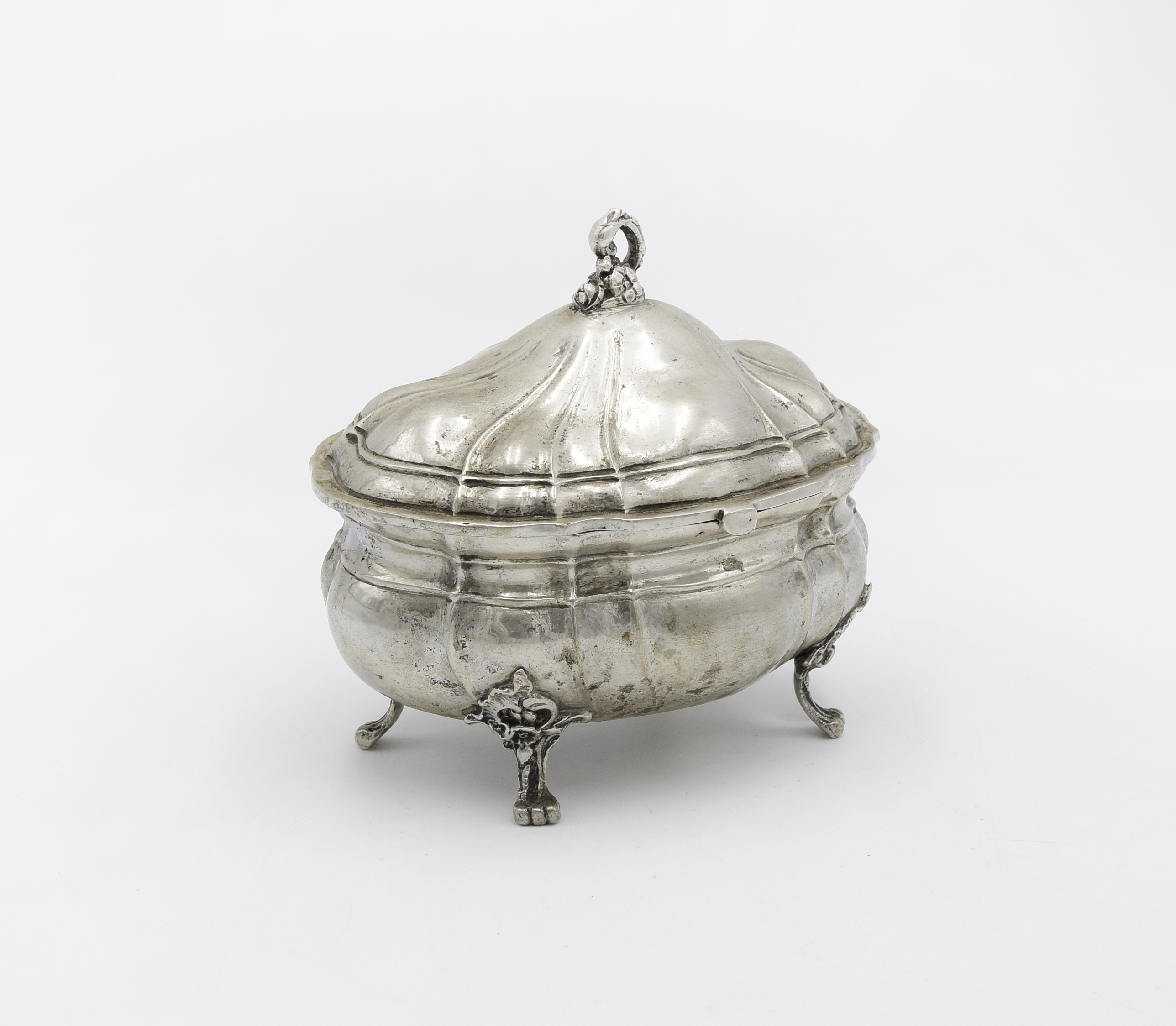 srebro cechowane (cechy fantazyjne imitujące augsburskie, monogram I[?]/IFR- w prostokącie); wys. 11 cm, szer. 13 cm, głęb. 9 cm; waga 309 g.;
