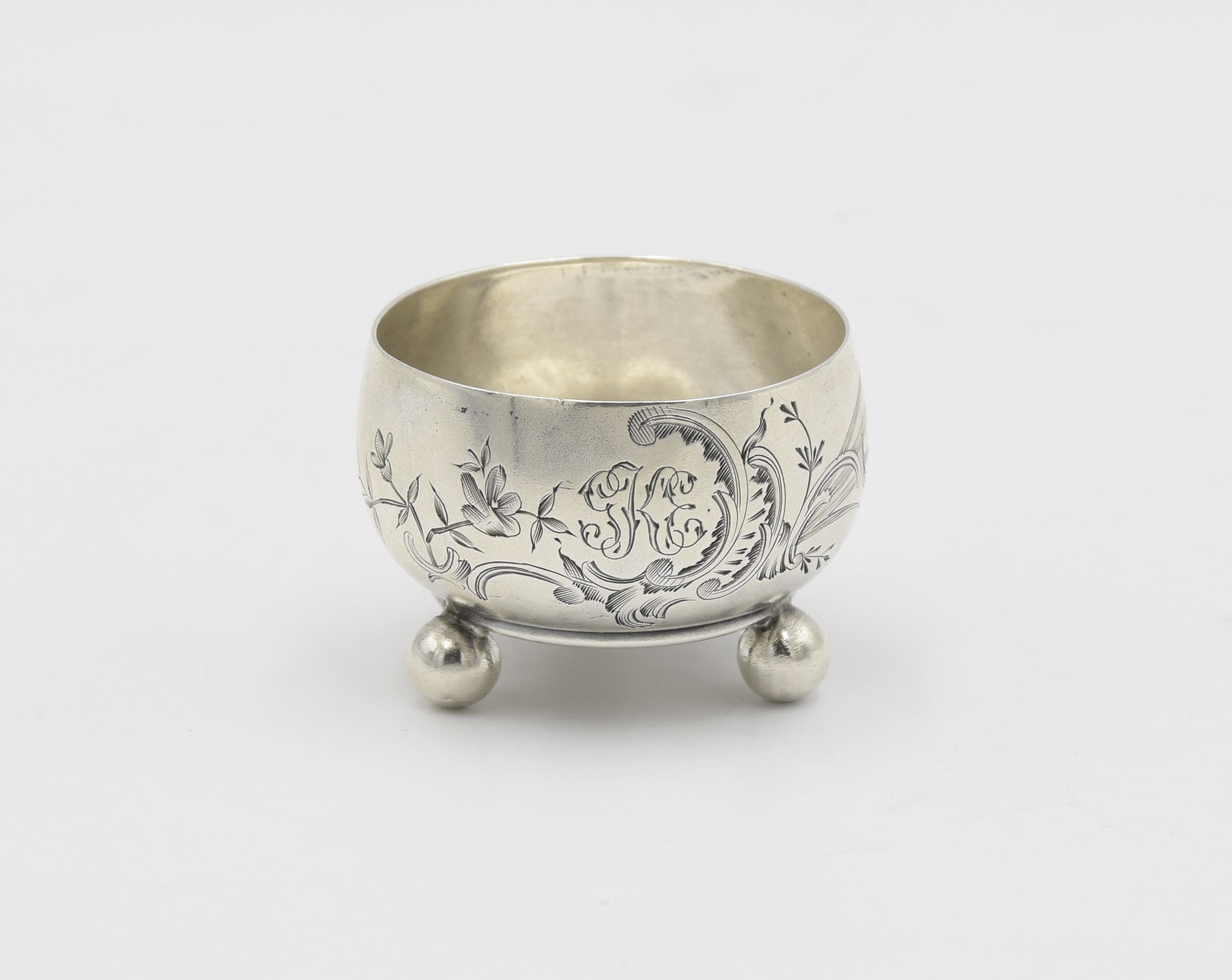 srebro próby 84 cechowane (cecha probierni z próbą, głową w kokoszniku i inicjałami probierza cyrylicą IŁ, monogram złotnika F.K - w owalu);wys. 3,5 cm, średnic