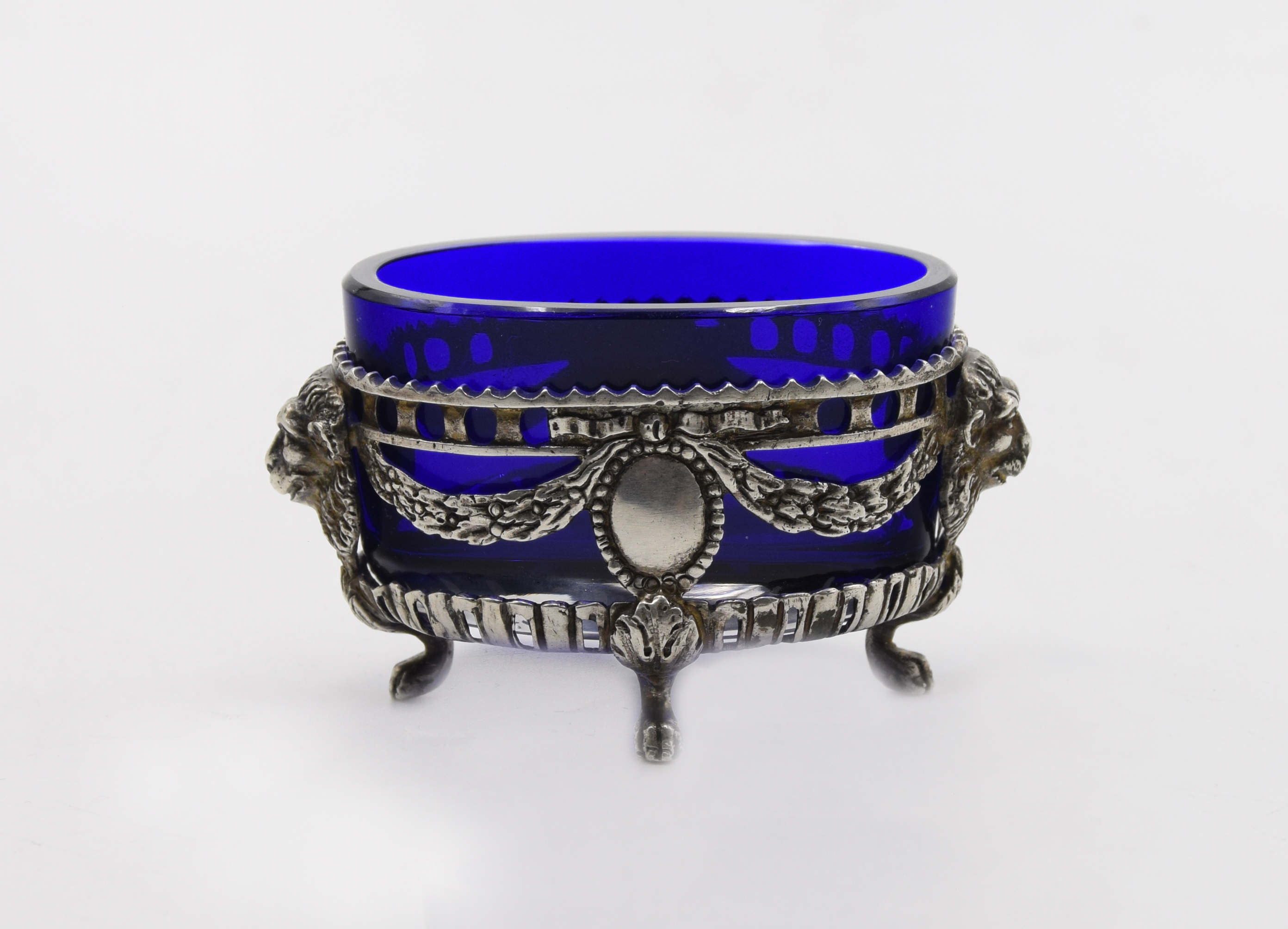 srebro próby 3 cechowane (polska cecha wybita po 1963 roku potwierdzająca próbę, cechy nieczytelne), szkło kobaltowe; wys. 4,8 cm; szer. 8,5 cm; głęb. 5 cm.