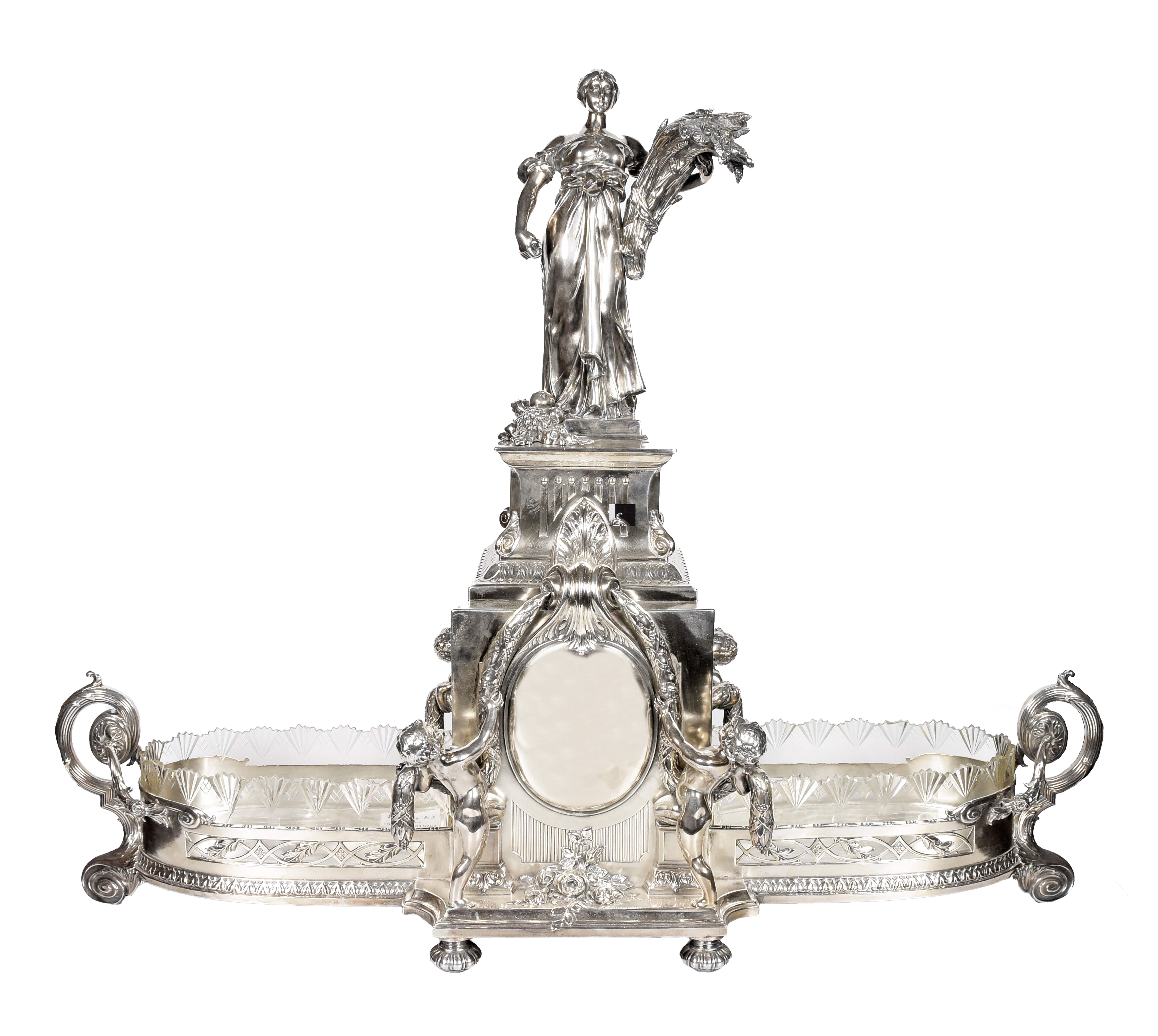 stop metali srebrzony (srebrzenie wtórne), szkło (jedno ze szkieł pęknięte); wys. 78 cm, szer. 60 cm, głęb. 31 cm;