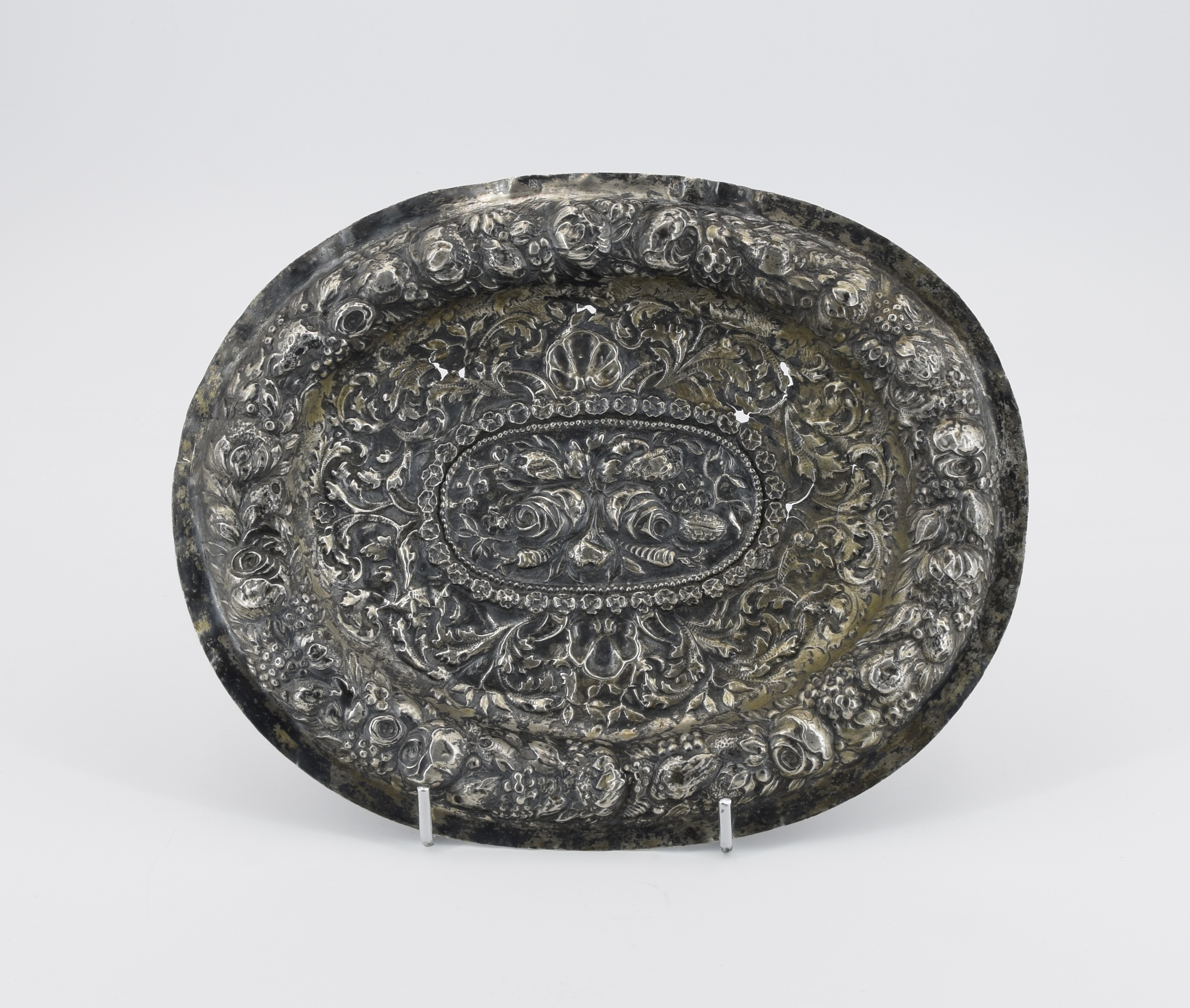 srebro cechowane (dwie nieznane cechy mało czytelne); wys. ok. 4 cm, szer. 26 cm, głęb. 21,5 cm; waga 157 g.