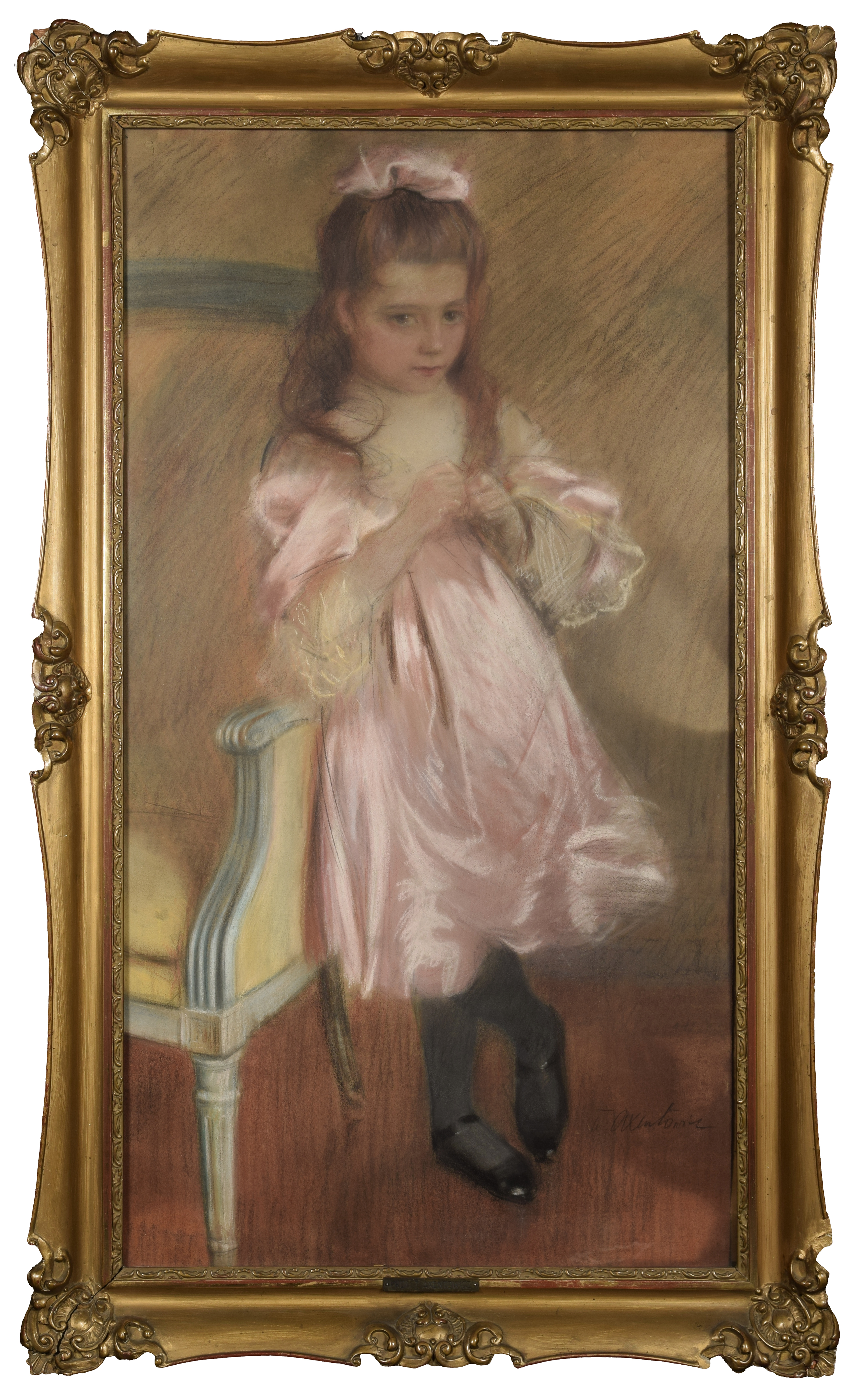pastel, papier; 97 x 52,5 cm (w świetle oprawy); sygn. p. d.: T. Axentowicz; na odwrocie nalepka z antykwariatu z Warszawy z ul. Mazowieckiej (nalepka poplamiona czarnym tuszem).