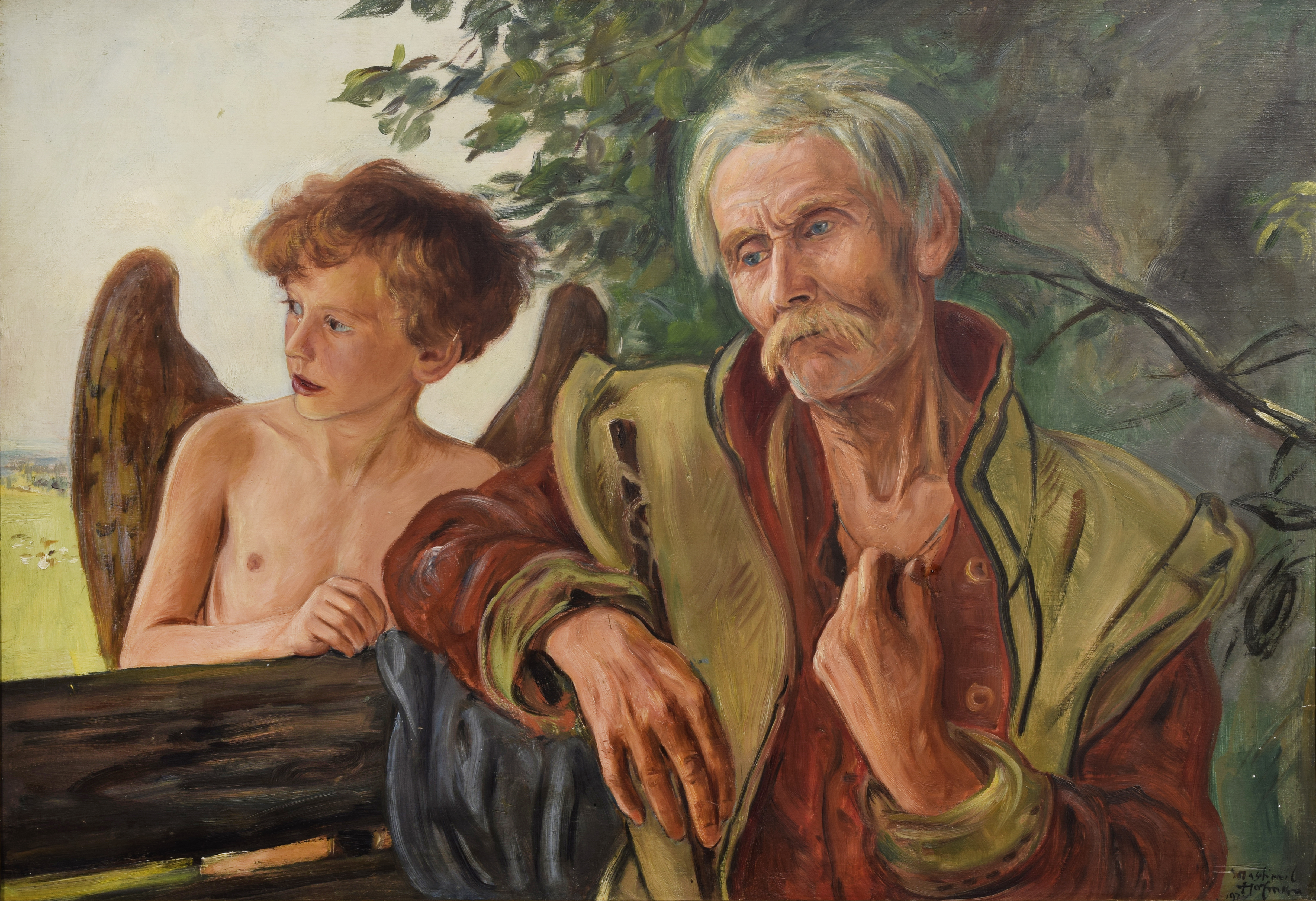 Wlastimil Hofman - jeden z najbardziej rozpoznawalnych przedstawicieli nurtu symbolicznego w sztuce polskiej pierwszej połowy XX w. Jako uczeń Jacka Malczewskiego pozostawał pod silnym wpływem jego wyobraźni symbolicznej, łączącej motywy realistyczne z metafizyczną refleksją nad ludzkim losem. W swojej twórczości artysta często sięgał po tematy egzystencjalne, religijne i alegoryczne, przedstawiając postacie aniołów, dzieci, starców czy wędrowców. Charakterystyczna dla Hofmana jest miękka, nastrojowa kolorystyka, subtelne światło oraz pewna melancholia obecna w spojrzeniach bohaterów jego obrazów. W oferowanym obrazie widzimy na pierwszym planie starszego mężczyznę o zamyślonym wyrazie twarzy, pogrążonego w refleksji oraz towarzyszące mu dziecko o anielskich skrzydłach. Zestawienie tych dwóch postaci - starości i niewinności - tworzy wyraźny kontrast symboliczny, sugerujący przemijanie, cykl życia oraz obecność sfery duchowej w codziennym doświadczeniu. Anioł, ukazany w sposób bardzo ludzki i bliski, nie ma charakteru triumfalnego, lecz raczej kontemplacyjny. Obraz cechuje się swobodnym modelunkiem oraz ciepłą, przytłumioną gamą barwną. Artysta operuje światłem w sposób podkreślający nastrój zadumy, a uproszczone tło kieruje uwagę widza na relację między postaciami. W „Odpoczynku” będącym symboliczną narracją autora, codzienność przenika się z metaforą, a prostota sceny skrywa głębokie, uniwersalne treści.