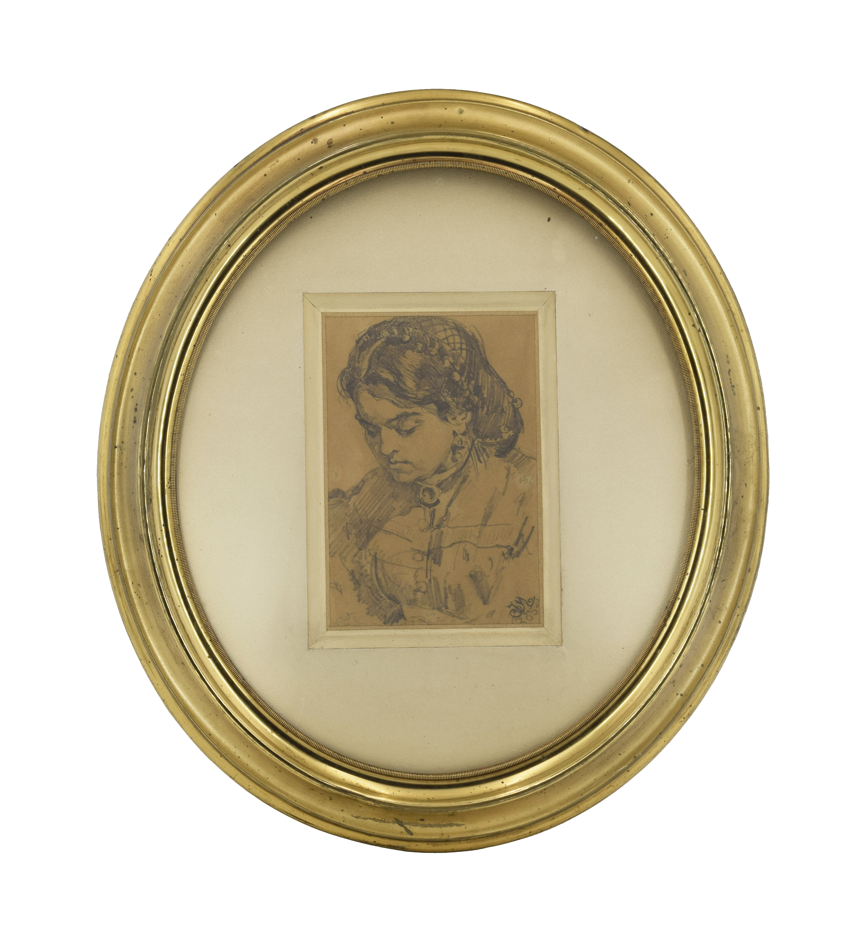 ołówek, papier; 14,5 x 10 cm (w świetle oprawy); sygn. i opisany p. d.: JM (monogram wiązany, dalej napis nieczytelny); na odwrocie oprawy napis: Teodora / z Giebułtowskich Matejkowa / dn 30/3 1846 r. P. w Krakowie / dn 25/8 1896 r. P. w Krakowie / … / r. P. 1863 (?, ołówkiem).