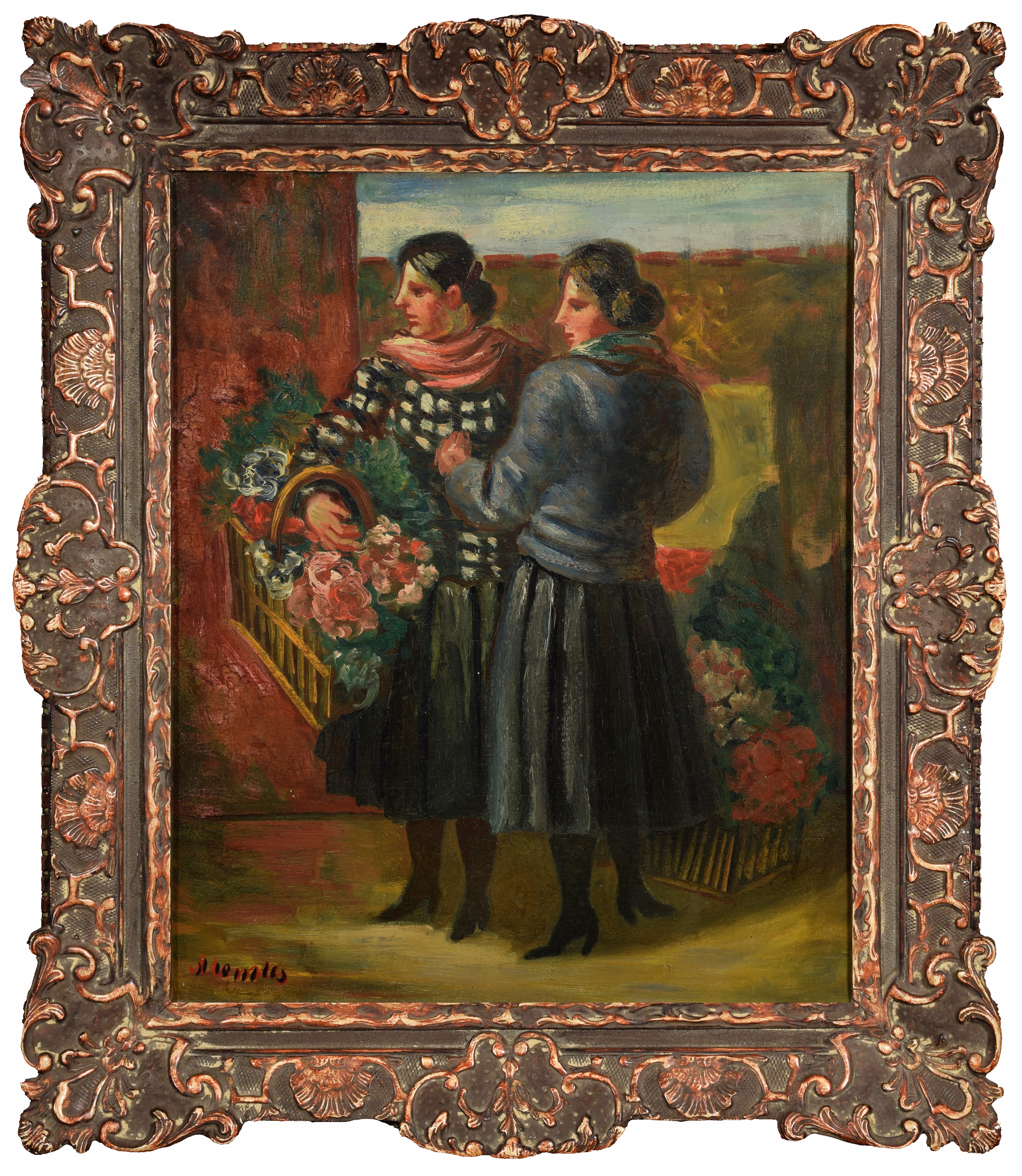 Zygmunt Menkes był malarzem związanym z École de Paris, którego twórczość łączyła elementy ekspresjonizmu i koloryzmu. W jego dorobku ważne miejsce zajmują sceny figuralne, w tym przedstawienia kobiet ukazywanych nie tylko jako indywidualne postaci, lecz także jako część codziennych sytuacji i zbiorowych kompozycji. W obrazach przedstawiających kobiety - takich jak scena dwóch kobiet na targu - artysta odchodzi od klasycznego portretu na rzecz ujęcia całej sylwetki w określonej przestrzeni i kontekście. Postaci są zazwyczaj syntetycznie opracowane, o uproszczonych kształtach i miękkim modelunku, co kieruje uwagę widza bardziej na układ kompozycji niż na szczegół. Kobiety u Menkesa często wpisane są w rytm sceny: stoją obok siebie, zajęte codzienną czynnością, tworząc zwartą, niemal dekoracyjną całość. Ich gesty są oszczędne, a kontakt między nimi - subtelny, sugerowany raczej przez układ ciał niż wyraźną narrację. Artysta nie koncentruje się na indywidualnej psychologii, lecz na relacji między postaciami oraz harmonii całej sceny. Kluczową rolę odgrywa kolor - intensywny, nasycony, budujący zarówno formę, jak i atmosferę targowej sceny. Plamy barwne organizują przestrzeń obrazu, a kontrasty kolorystyczne podkreślają obecność postaci i ich wzajemne powiązania. W efekcie przedstawienia kobiet u Menkesa mają charakter uogólniony i ponadczasowy - są bardziej studium formy, koloru i rytmu niż realistycznym zapisem konkretnej sytuacji.