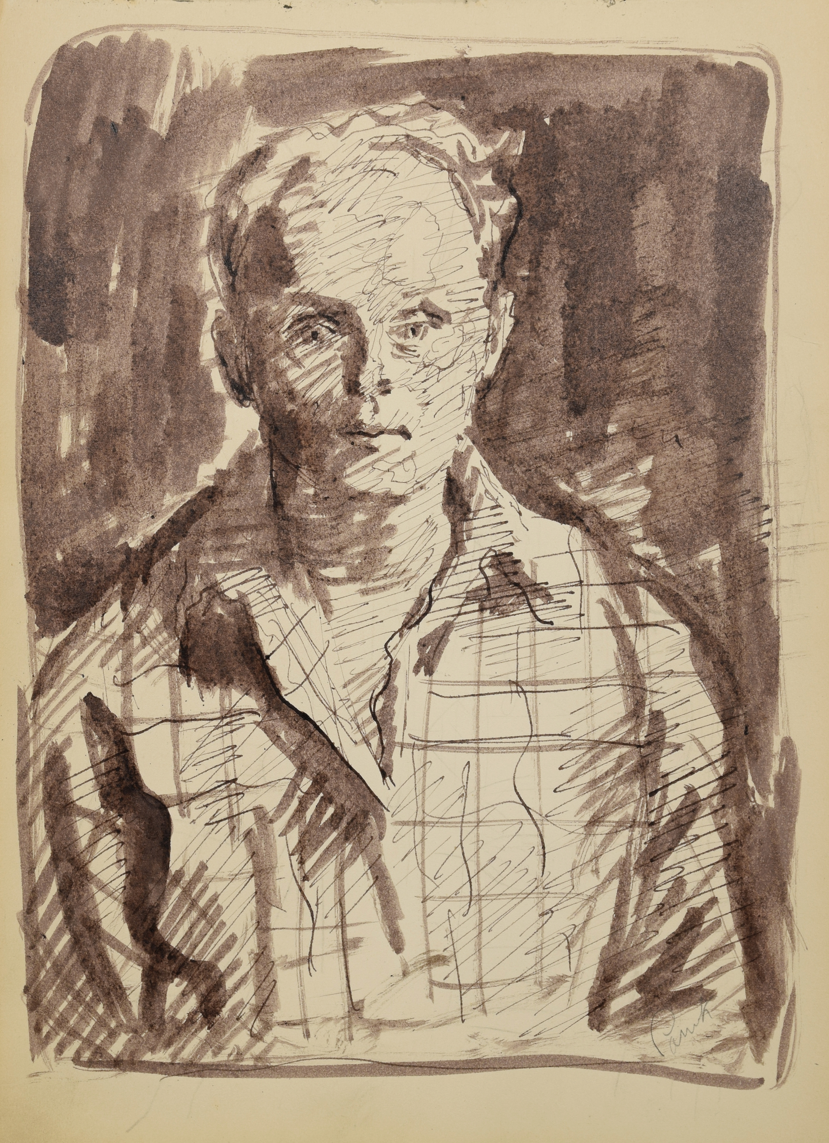 piórko, tusz brązowy, papier; 20,5 x 28 cm;