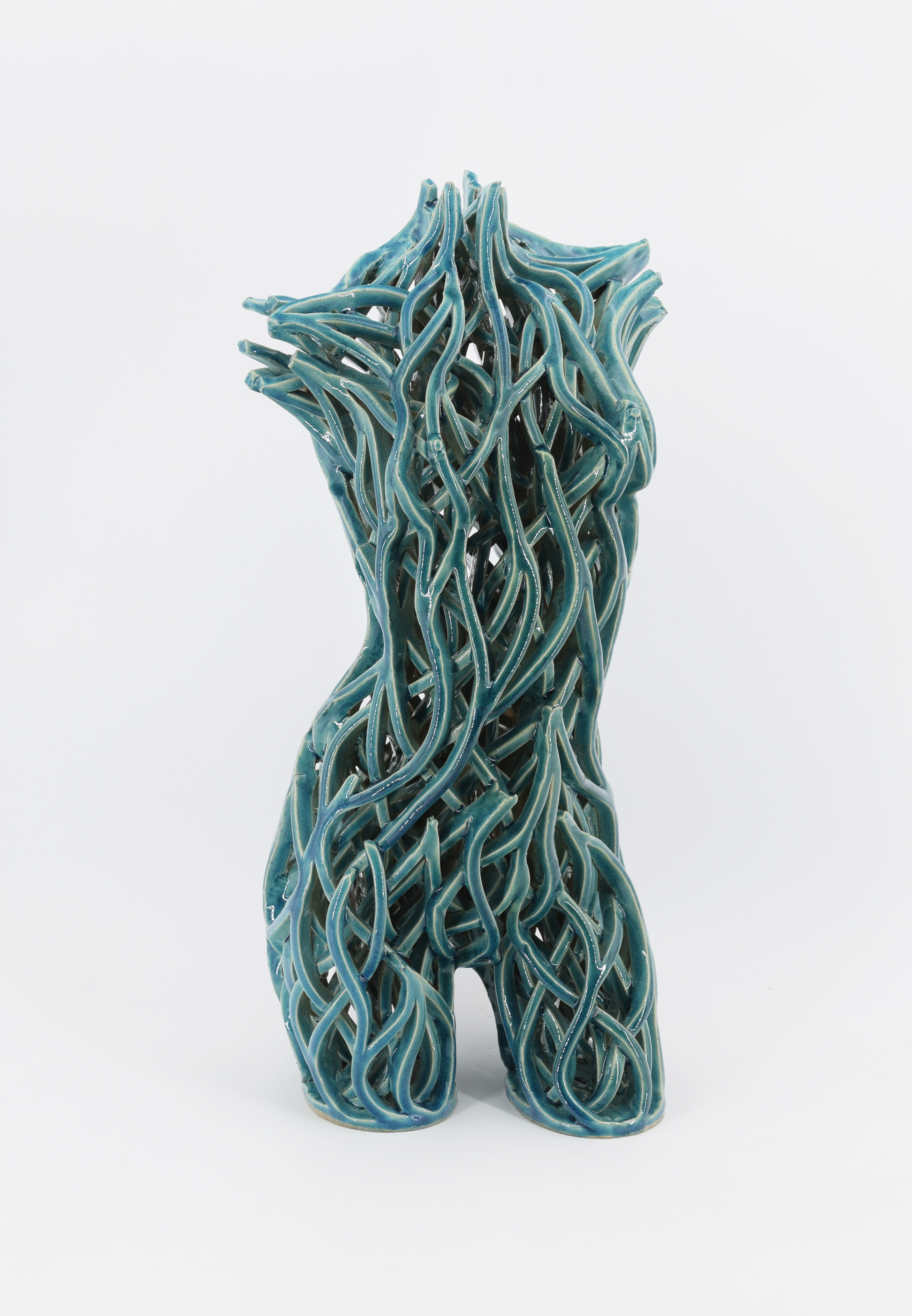 rzeźba ceramiczna szkliwiona w kolorze zielonym, ażurowa; wys. 49 cm;