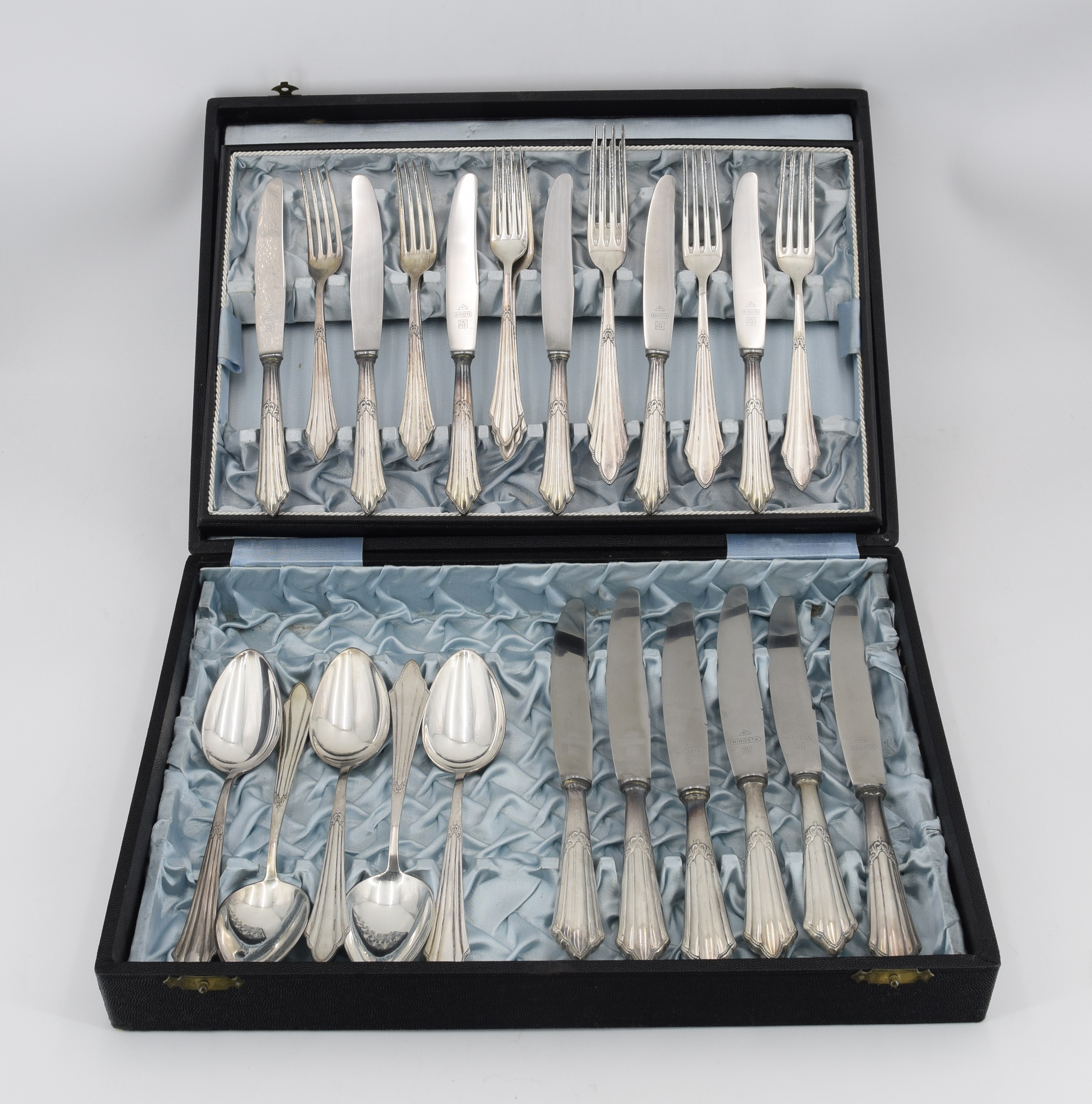 plater; noże duże 6 szt. o dł.: 25 cm, łyżki 5 szt. o dł.: 20,8 cm, noże małe 6 szt. o dł.: 21 cm, widelce duże 6 szt. o dł: 20,2 cm