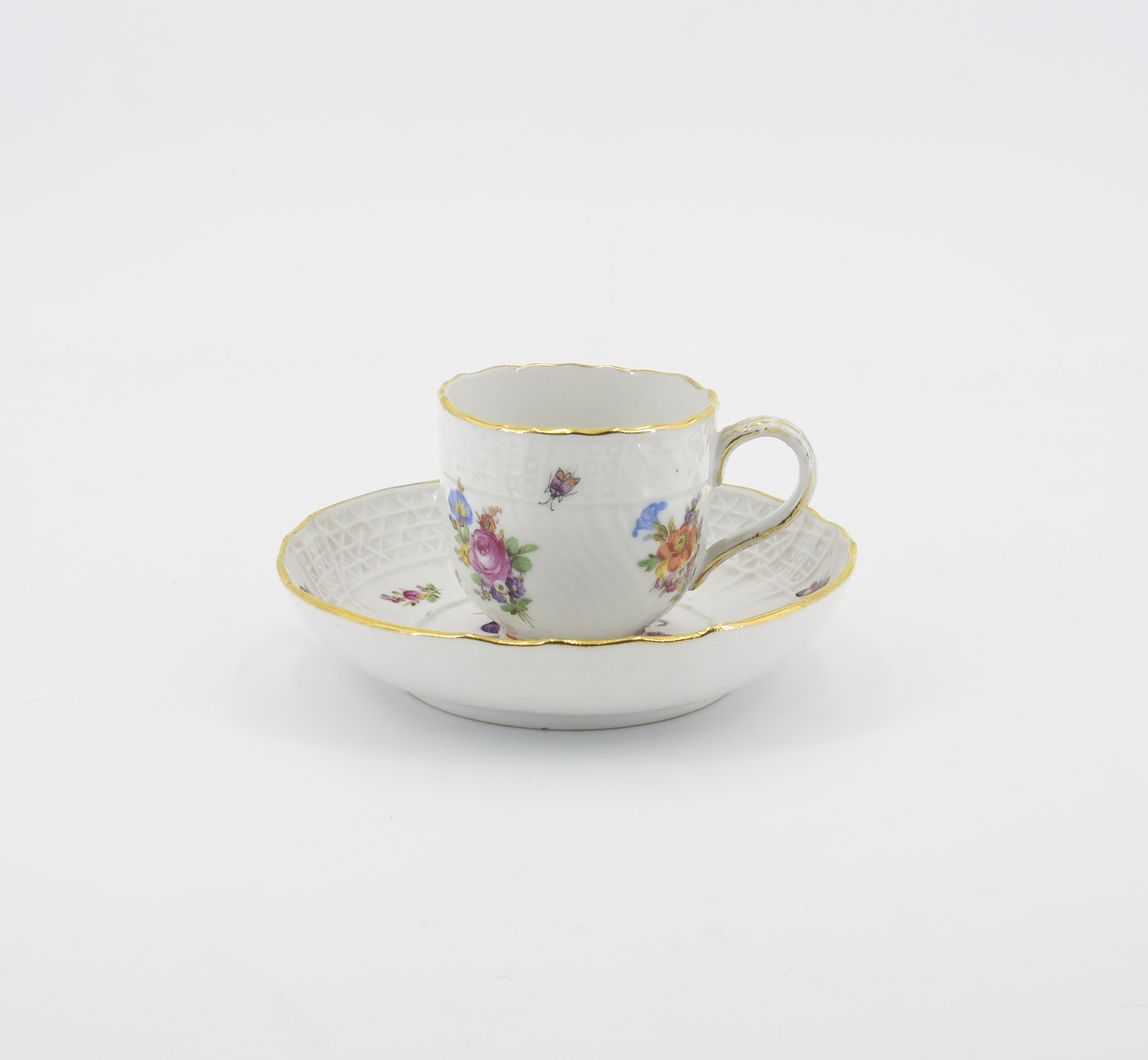 porcelana, farby naszkliwne, złocenie; wys. filiżanki: 6 cm, śr. talerzyka: 13,3 cm;