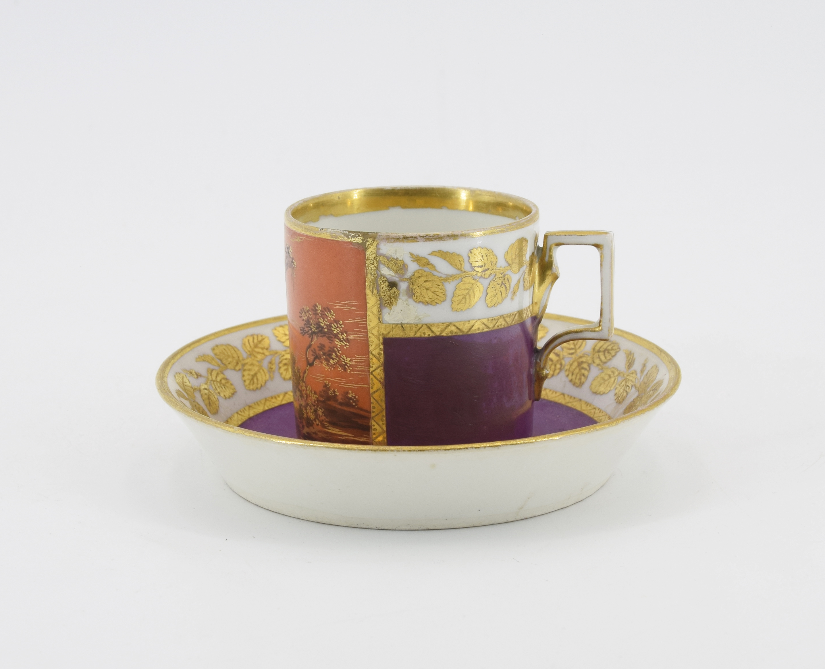 porcelana, farby naszkliwne, złocona; wymiary: filiżanka - wys. 6 cm, spodek - śr. 13,4 cm;