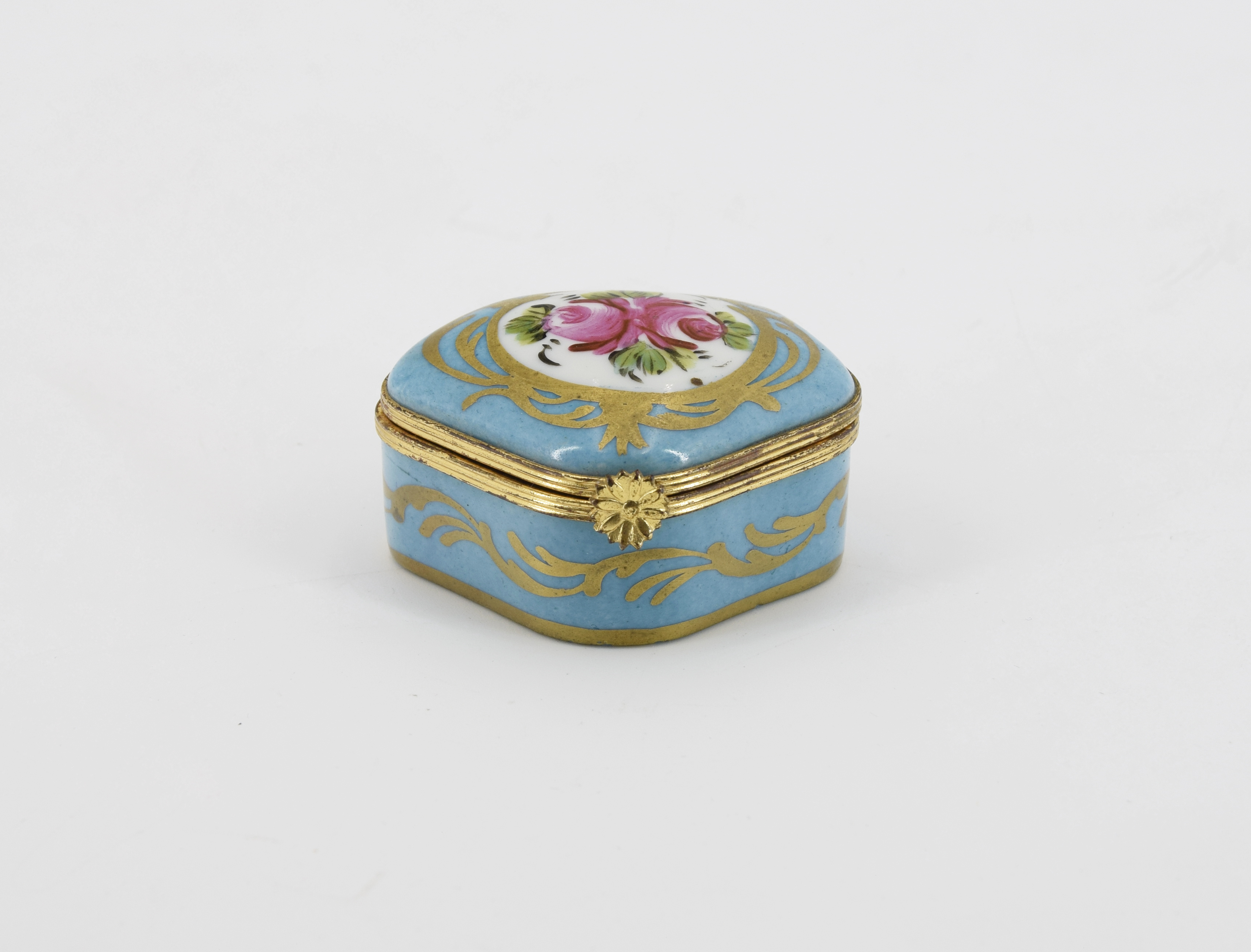 porcelana, farby naszkliwne, złocenie, mosiądz; wym.: 3,2 x 6,5 x 5,3 cm;