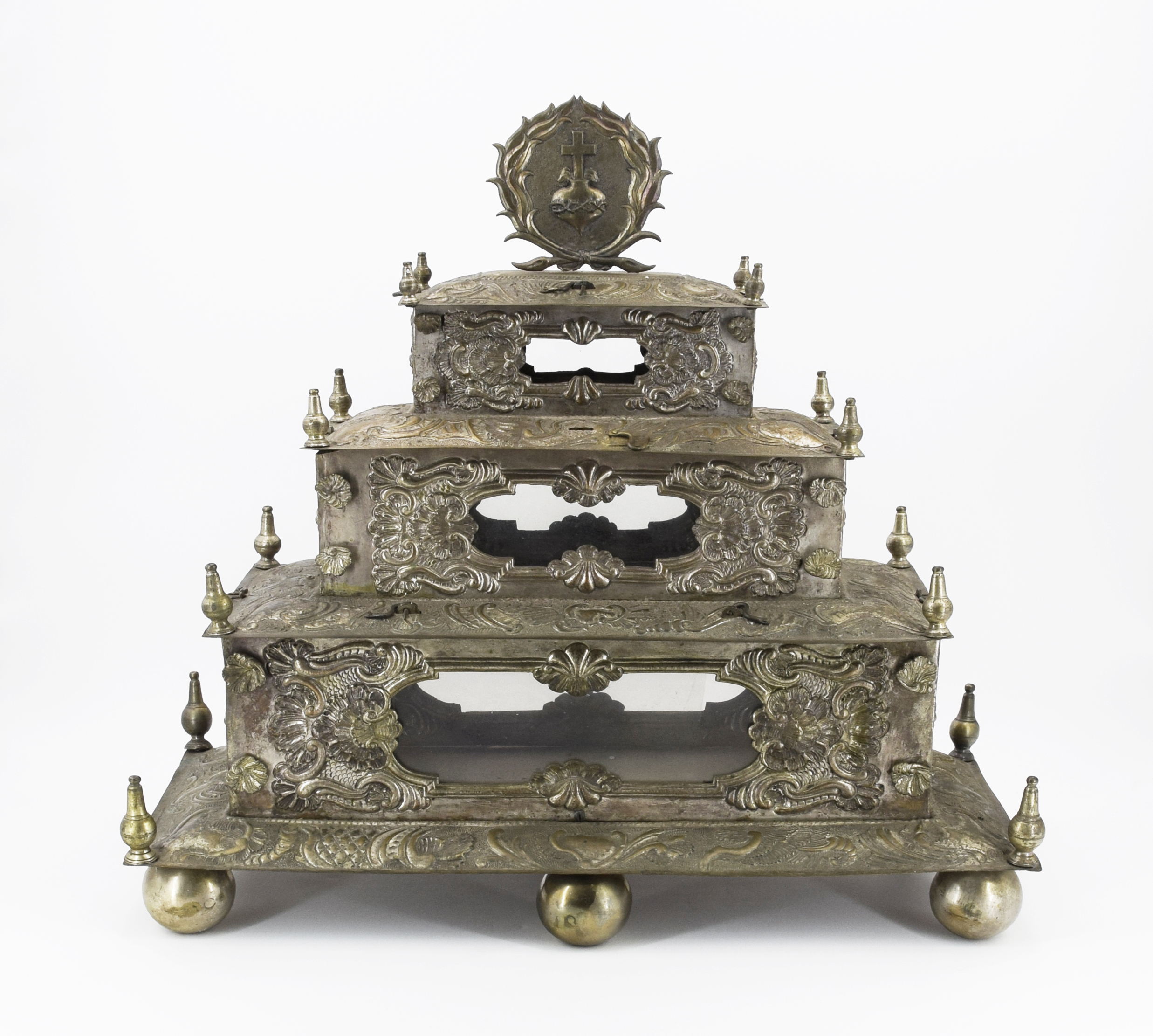 blacha miedziana i mosiężna repusowane, niesygnowane; wys. 49 cm, szer. 49 cm, głęb. 22,5 cm. Dolny Śląsk?, XVIII w. Relikwiarz wsparty na 6 masywnych kulkach, piętrowy, schodkowy, składający się z nałożonych na siebie trzech różnej wielkości prostopadłościanów z wyciętymi na każdej ze ścianek bocznych, przeszklonymi otworami do oglądania relikwii, ujętymi w ramkę z gładkiego półwałka; dekorowane motywami ze stylizowanych muszli, esownic, rybiej łuski i małżowin; każda część nakryta spadzistym daszkiem zdobionym w narożach sterczynkami; w szczycie kolista plakietka ujęta w wieniec z przedstawieniem Serca Jezusowego na tle groszkowanym. Stan zach.: po konserwacji w Muzeum Narodowym we Wrocławiu (drobne naprawy), brak relikwii; Pochodzenie: obiekt zakupiony na rynku antykwarycznym Dolnego Śląska.