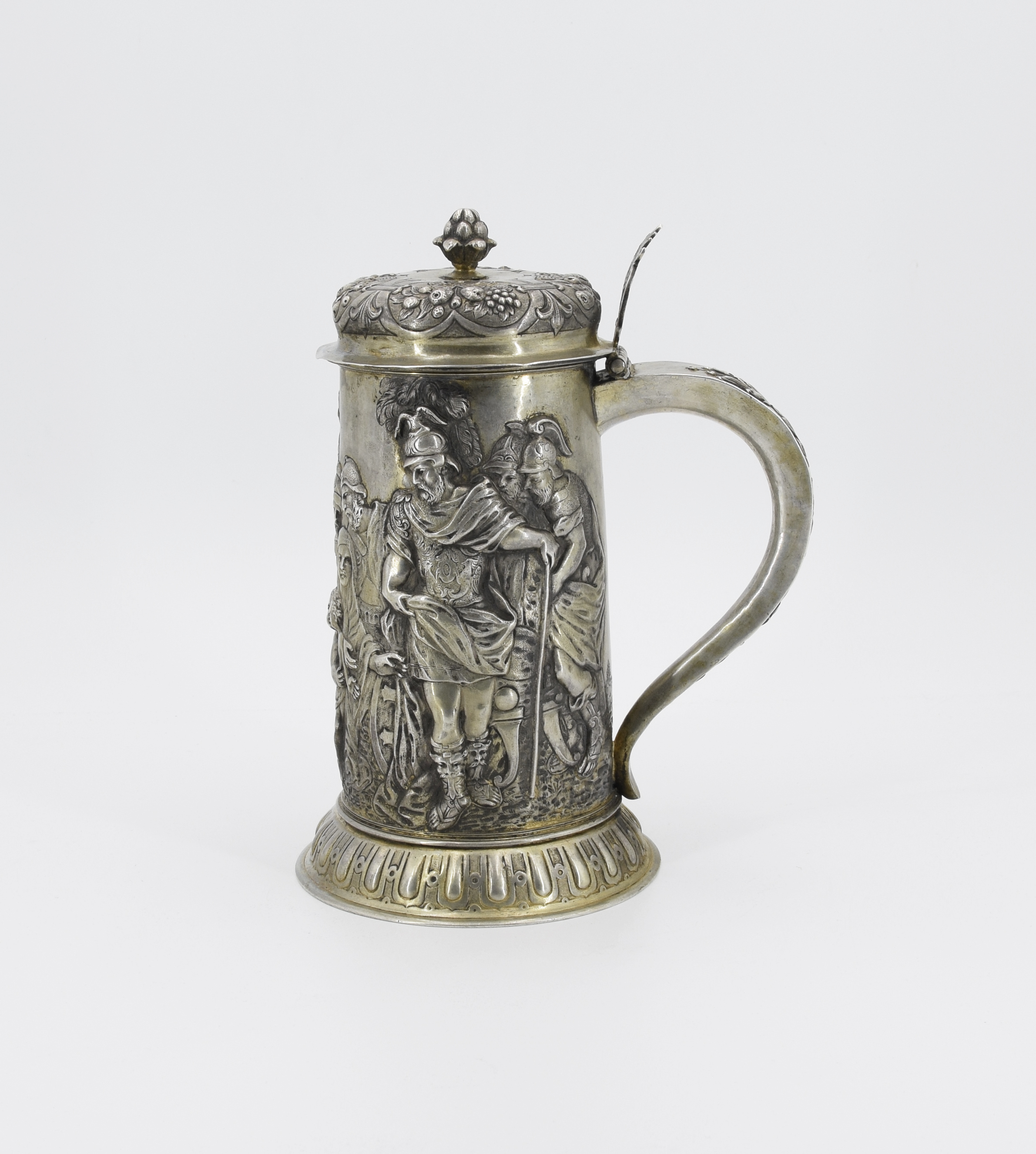srebro niecechowane częściowo złocone (na spodzie bita w głąb litera E i znak niezidentyfikowany w owalu); wys. 23,5 cm, szer. 17,5 cm, głęb. 12,7 cm; waga 649 g. Niemcy?, poł. XIX w. Na kolistej stopie, dekorowane półwałkiem z ornamentem z pukli i cekinów, z korpusem konicznym ozdobionym reliefową sceną rodzajową z przedstawieniem grupy rycerzy i ich wodza przed którym klęczą dwie kobiety, prawdopodobnie matka z córką, młodsza obejmuje dwójkę małych dzieci, a starsza z wyciągniętymi rękoma prosi o litość dla nich, za nimi stoją przytulone do siebie dwie kobiety, z zaciekawieniem obserwujące scenę; z boku ceowate ucho z dekoracją kwiatową, nakrywka na zawiasie, wywyższona, dekorowana bukietami owoców umieszczonych w trzech dwulistnych rezerwach, zwieńczenie w formie karczocha?; wnętrze złocone.