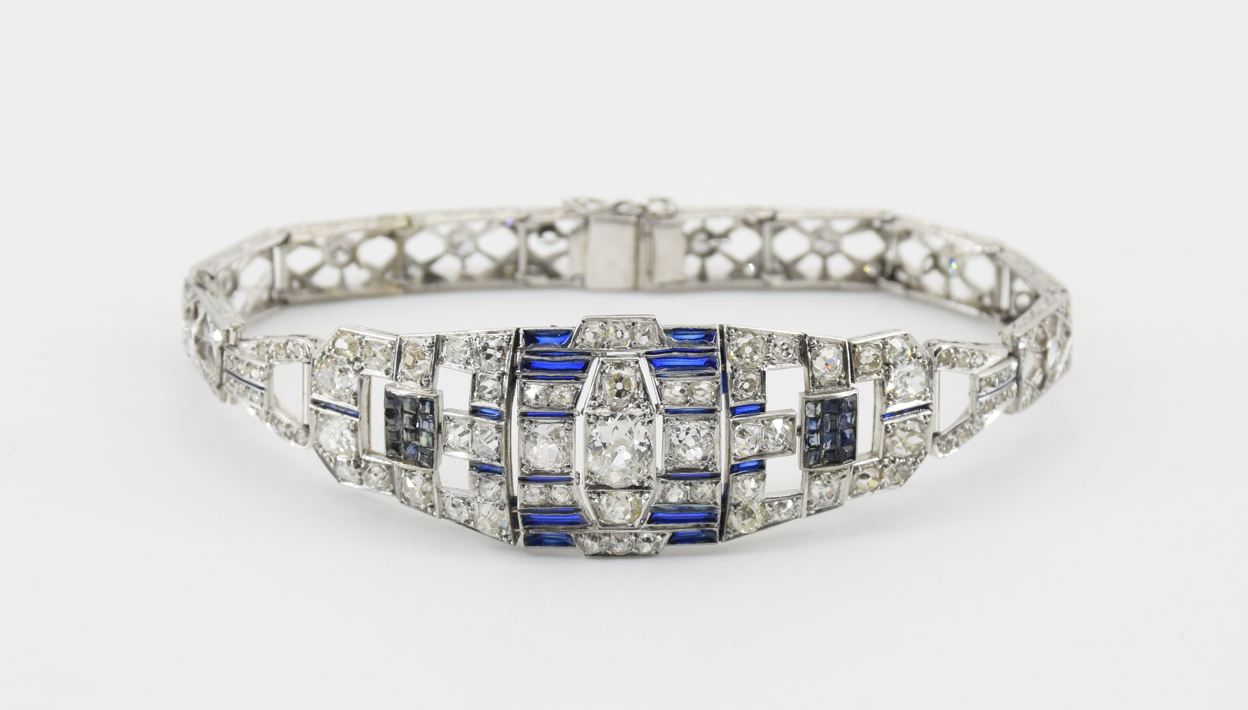 diament w szlifie dawnym + 124 szt. diamentów w szlifie dawnym + 24 szt. szafirów;