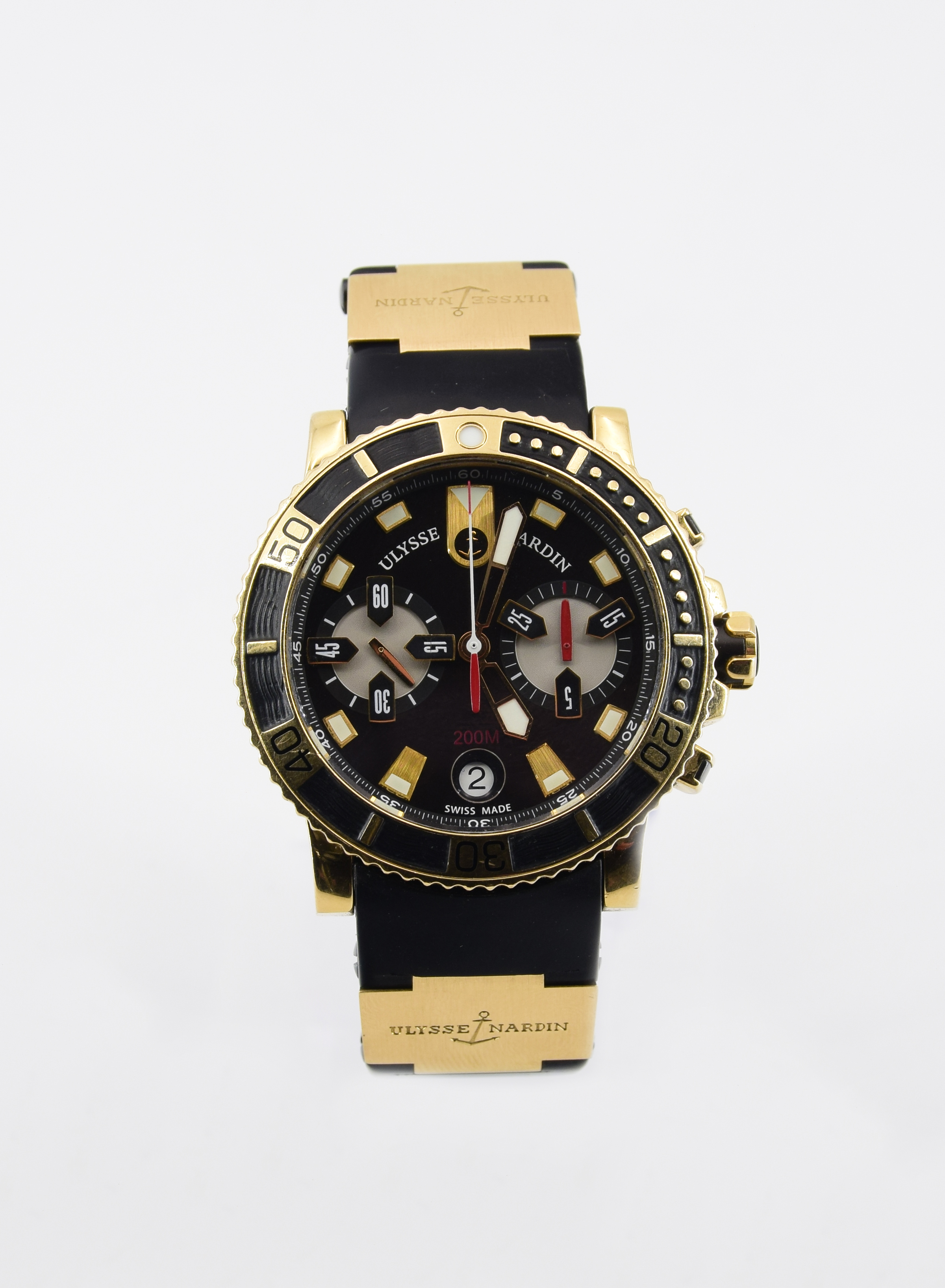złoto 18K, stal, bransoleta kauczukowa, szkło szafirowe; koperta o wymiarze: 42,7 mm;