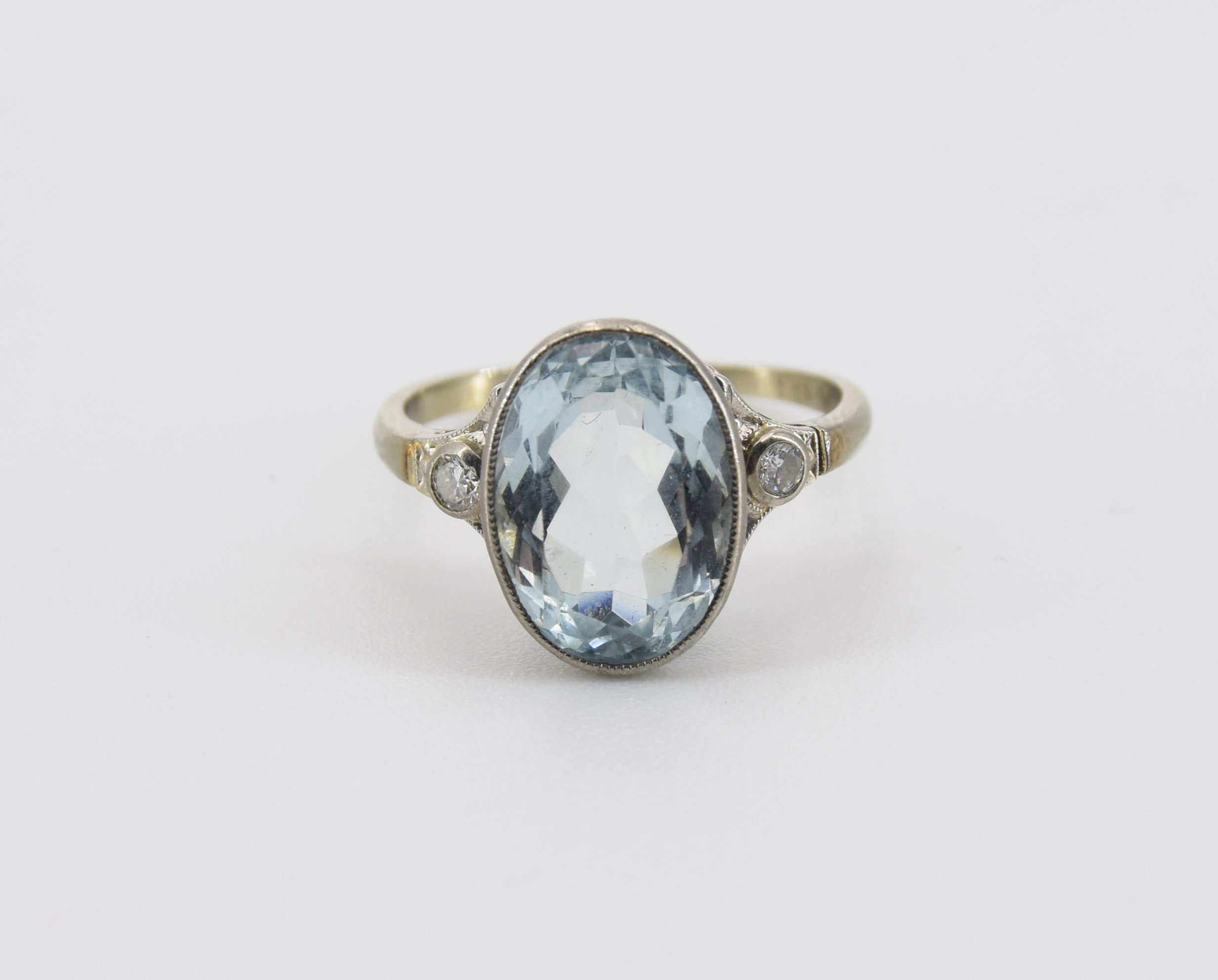 pojedynczy, owalny, fasetowany akwamaryn oraz 2 szt. brylantów;