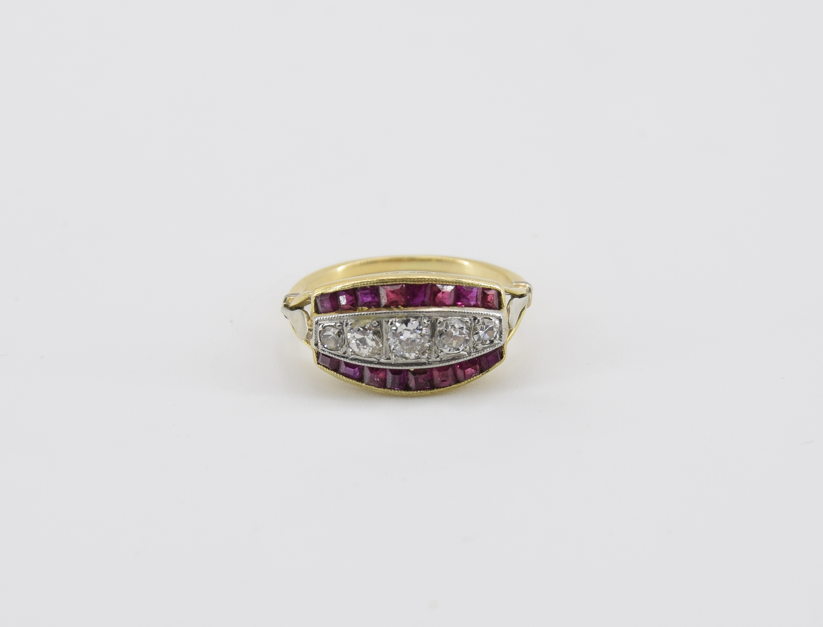 16 szt. prostokątnych, fasetowanych rubinów oraz 5 szt. diamentów;