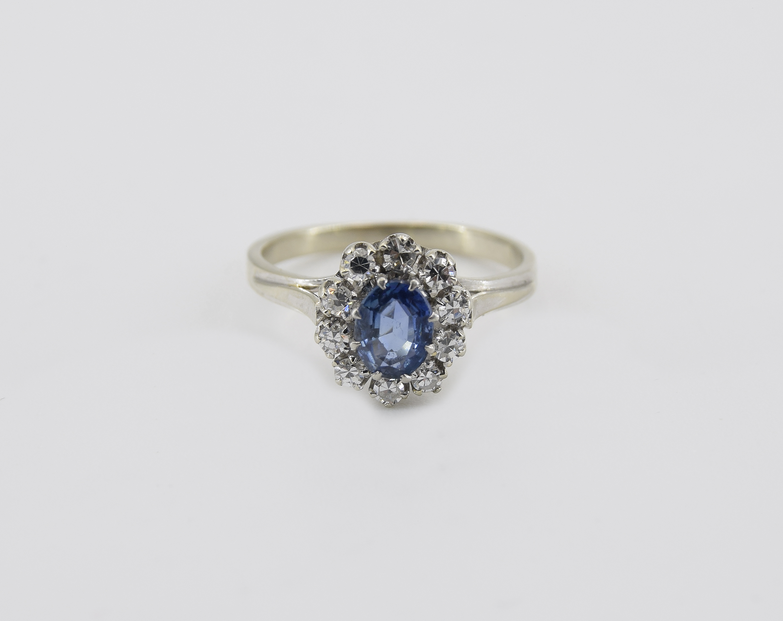 szafir cejloński o masie ok. 0.65 ct w otoczeniu 10 szt. diamentów;