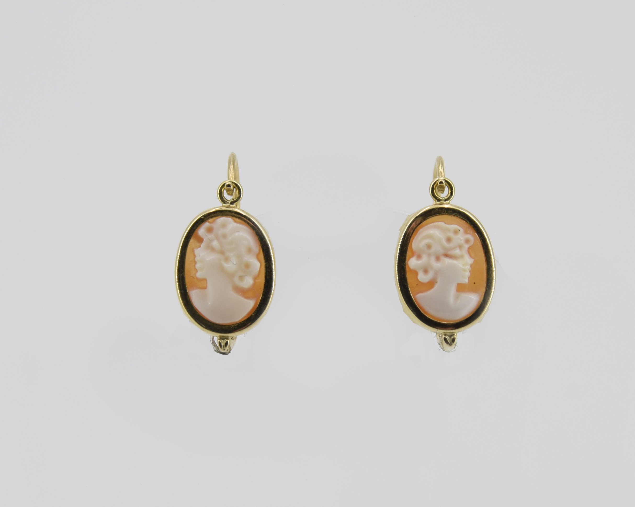 wiszące, owalne popiersia kobiety rzeźbione na muszli o wym. 6.50 x 9.50 mm w oprawie,