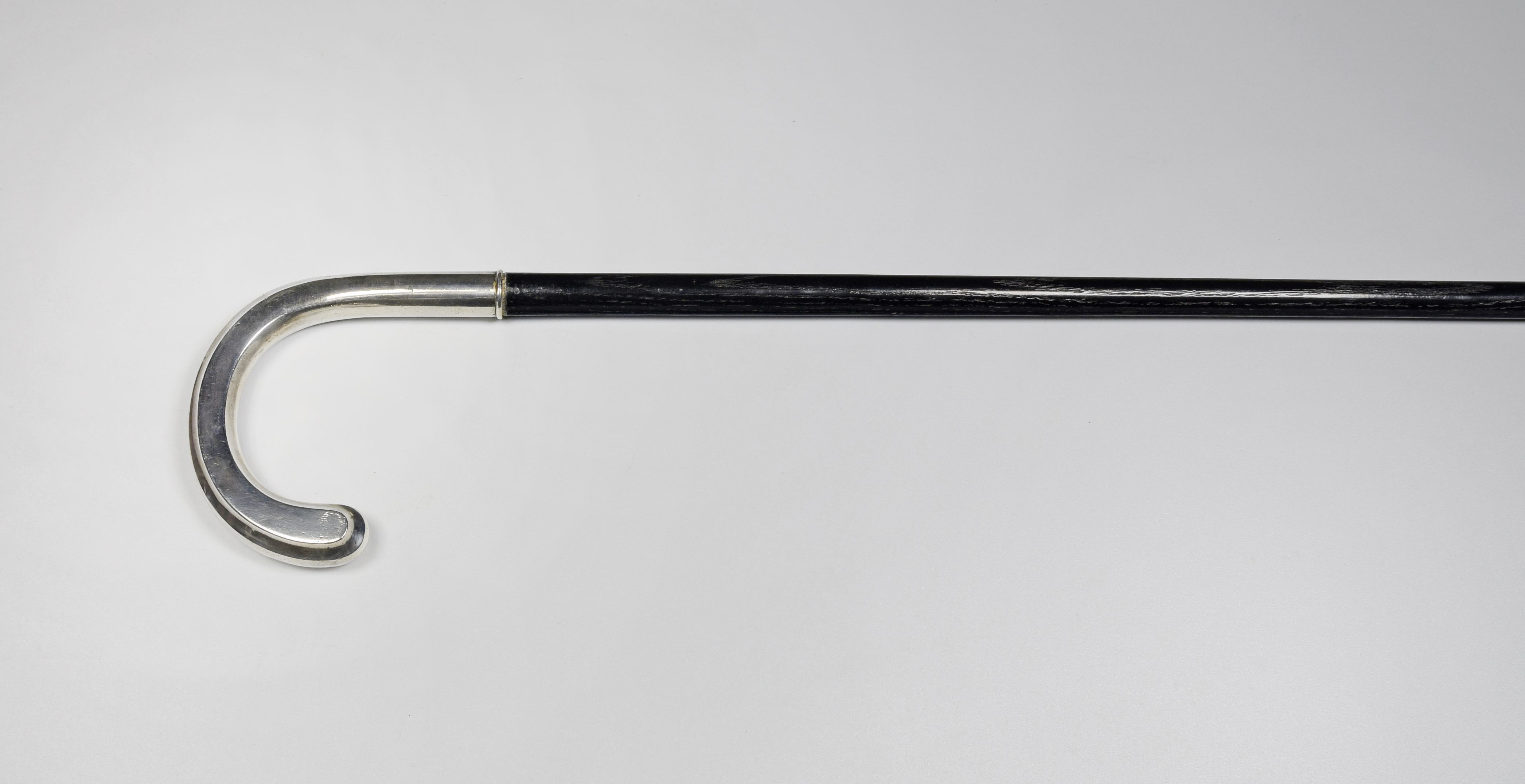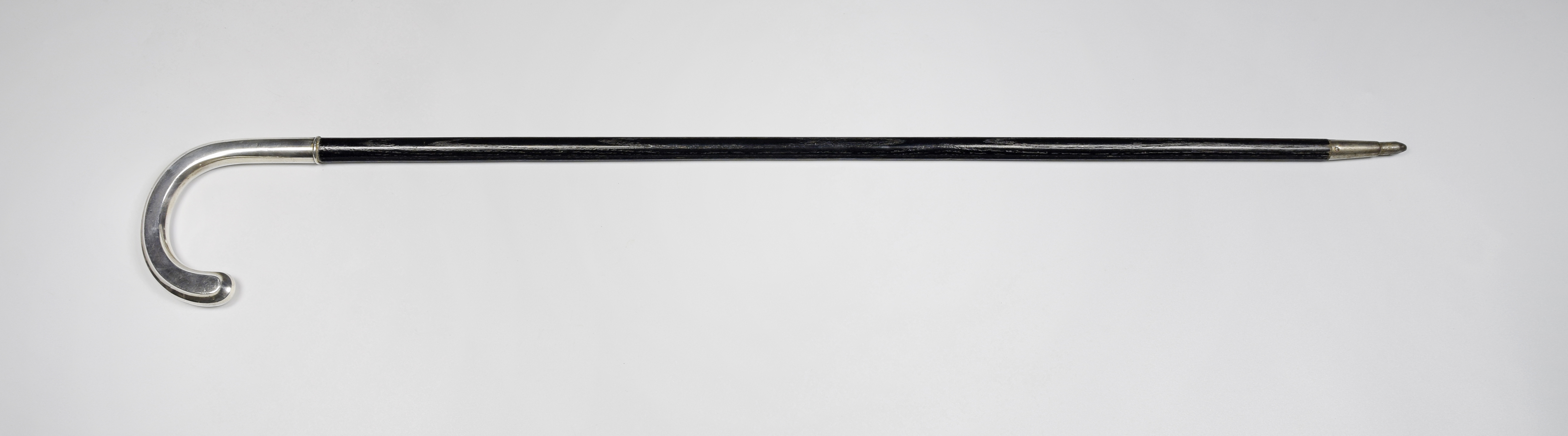 drewno czernione, uchwyt w kształcie haka wykonany ze srebra (pr. srebra 900), zakończenie laski za stali; dł. całkowita: 86 cm;