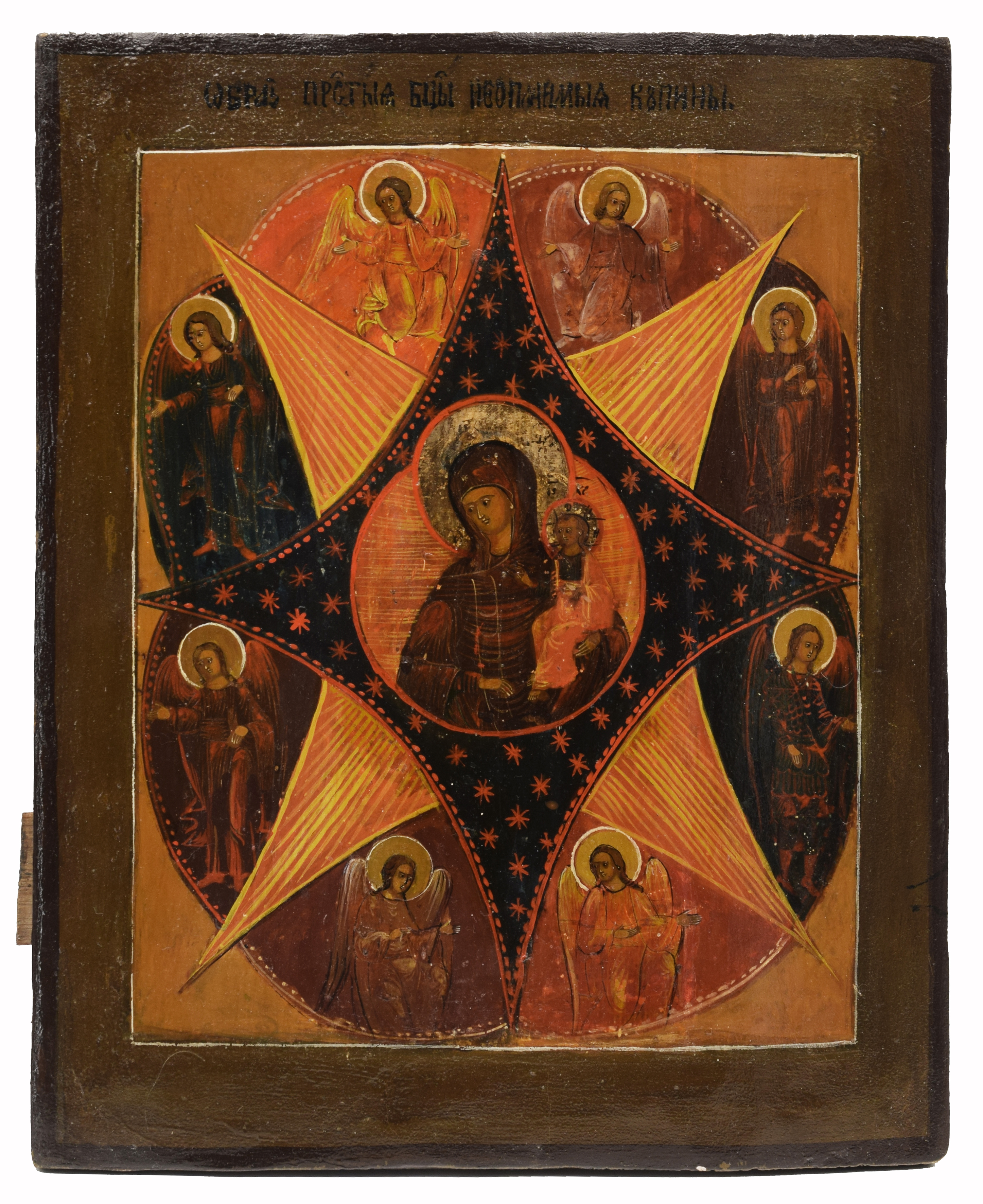 tempera, deska, podkład kredowo-gipsowy, nimby srebrzone; 38,5 x 31,4 x 2 cm; z tyłu ikony dwie szpongi. Rosja, XIX w. W centrum ikony znajduje się Matka Boża z Dzieciątkiem na lewej ręce oraz drabiną w prawej (drabina swą górną częścią dotyka ramienia Bogarodzicy i symbolizuje wznoszenie poprzez Nią ludzkości od ziemi do nieba). Wokół Matki Bożej znajduje się osiem promieni, uformowana z dwóch prostokątów, gwiazda. Jeden z tych prostokątów jest koloru czerwonego z żółtymi pasami i symbolizuje barwę płomieni, a drugi ciemny z motywem gwiazdek. Przestawienie odnosi się do czasu starotestamentowego. Prorok Mojżesz widział na Górze Synaj znajdujący się w ogniu lecz niespalający się krzew. Tu miało to symbolizować dziewicze macierzyństwo Matki Bożej, poczęcie Zbawiciela z Ducha Świętego. Bogarodzica będąc Matką pozostała Dziewicą, przed narodzeniem Chrystusa, podczas i po Jego narodzinach. Matka Boża w otoczeniu ośmiu Archaniołów. Bordiura jednolita ciemna, w niej u góry napisy objaśniające cyrylica: Mater’ Bożija Neopalimaja Kupina”. Zgodnie z tradycją ludową Ikona Matki Bożej "Gorejący Krzew" uważana jest za chroniącą dom przed ogniem. Święto Ikony Matki Bożej "Gorejący Krzew" obchodzone jest 4/17 września.