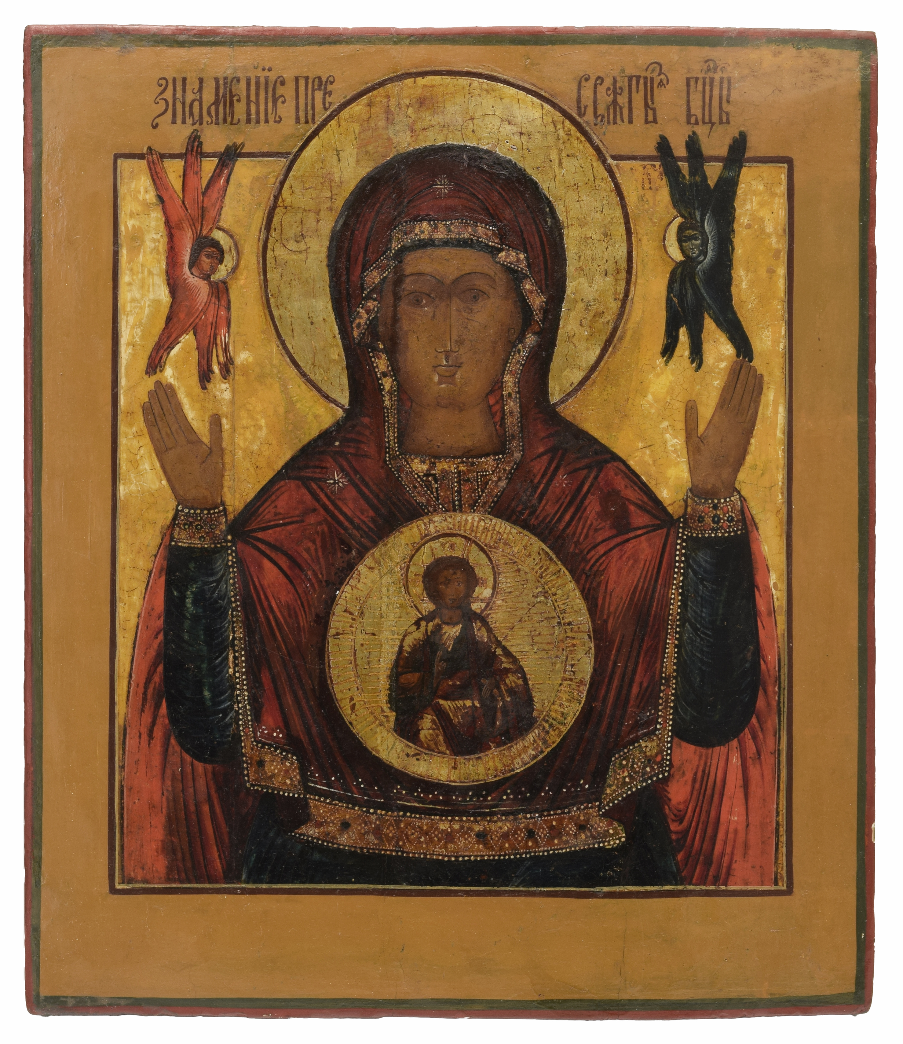 tempera, deska, podkład kredowo-gipsowy, srebrzenia szkliwione na złoto; 35,4 x 30,8 x 3 cm. Rosja, pocz. XIX w. Przedstawienie Matki Bożej Znak jest jednym z pierwszych wizerunków Bogarodzicy. Ikona Matki Bożej jako Orantki (modlącej się), symbolizuje jej wstawienniczą modlitwę; szczególnie czczona w Rosyjskim Kościele Prawosławnym. Matka Boża ze wzniesionymi w geście modlitewnym dłońmi, w pozycji siedzącej lub stojącej, w owalnej sferze ukazany jest Jezus - Emmanuel ze zwojem w ręku i gestem błogosławieństwa. Owal - symbol objawienia i boskiej przynależności. Na wysokości srebrzonego nimbu Bogarodzicy wokół ukazane Serafiny. Trzy gwiazdki usytuowane na szalu osłaniającym Matkę Bożą wskazują na Jej dziewictwo przed, w czasie i po narodzeniu Jezusa Chrystusa. Emmanuel w nimbie krzyżowym (atrybut ikonograficzny przysługujący jedynie Zbawicielowi, przypominający o Jego śmierci na krzyżu). Na nimbie wypisane są greckie litery oznaczające "Jestem Który Jestem" - imię Boga, przynależne też Boskiej naturze Chrystusa. Bordiura jednolita ugrowa, w niej u góry napisy objaśniające cyrylicą: "Znamienije Presvatoj Bogorodzicy”. Obramienie ujęte niebieskim i czerwonym pasem. Ikona zyskała opinię cudownej po oblężeniu Nowogrodu przez wojska księcia Andrzeja I Bogolubskiego.