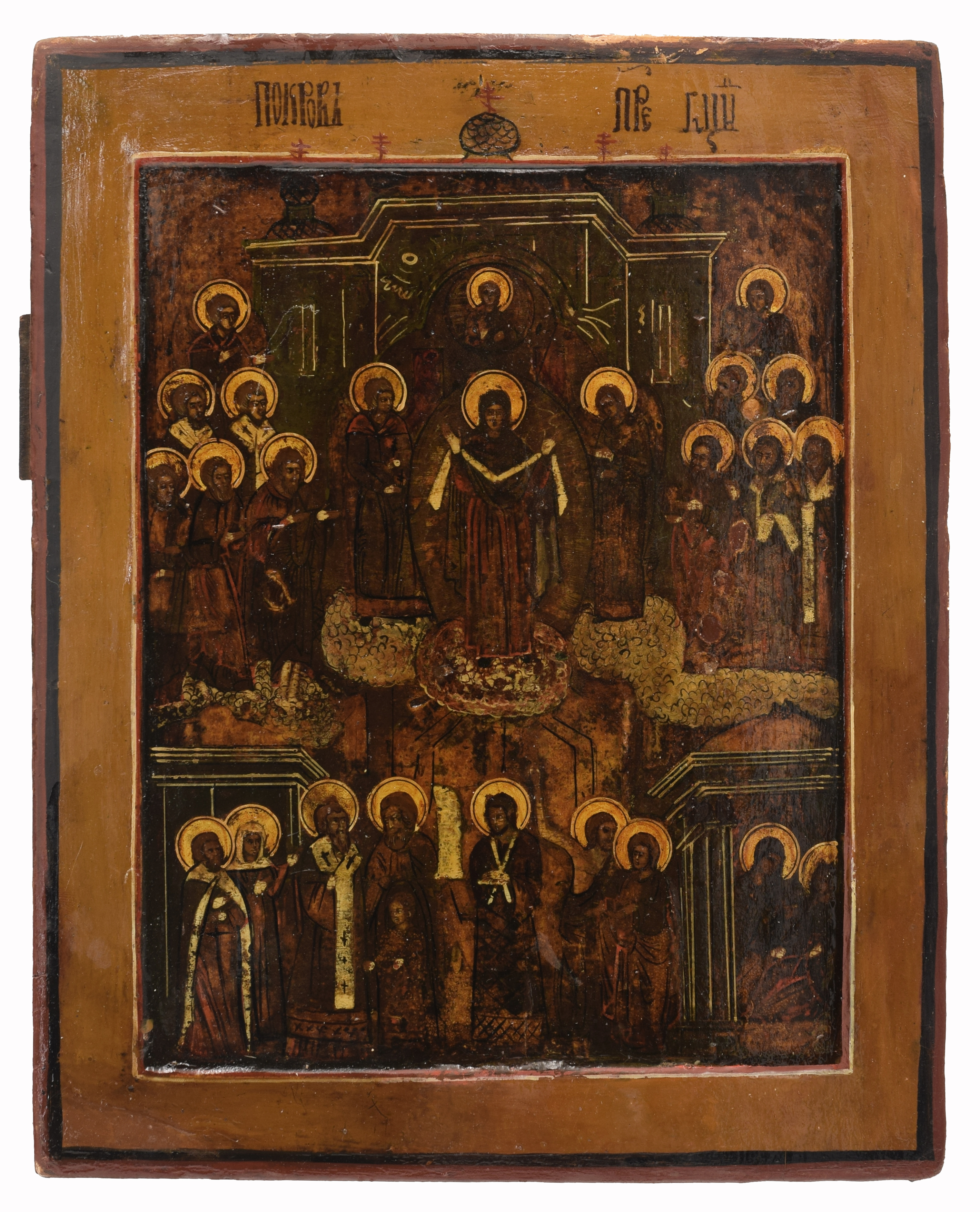 tempera, deska, podkład kredowo-gipsowy, nimby srebrzone; 33,2 x 27,2 x 2,5 cm; z tyłu ikony dwie szpongi. Rosja, pocz. XIX w. Dwustrefowy obraz o rozbudowanych treściach ikonograficznych, wpisany w architektoniczne ramy, z kopułami cerkwi i monastyrów. W górnej strefie przedstawienie Matki Boskiej z welonem w dłoniach na tle mandorli jako najpotężniejszej orędowniczki, pośredniczki i opiekunki ludzkości. Wokoło Bogarodzicy Archaniołowie, następnie Święci. Nad Matką Bożą w medalionie Jezus Chrystus z uniesioną prawą dłonią w geście błogosławieństwa. W dolnej strefie centralną postacią jest Święty Roman Słodkopiewca (zm. ok. 555 r.), autor hymnów (kontakionów) ku czci Maryi, zakrystianin w Świątyni Hagia Sophia w Konstantynopolu. Wśród postaci cesarska para Leo i Zoe, Święty Andrzej Jurodiwy z Epifaniuszem. Powyżej wizja Świętego Andrzeja. Wizja Świętego Andrzeja Szaleńca Bożego (Jurodiwego), który stojąc ze swoim uczniem Epifaniuszem ujrzał Matkę Bożą unoszącą się w otoczeniu Aniołów i Świętych, rozpostarła Swój Welon (Maforion) nad wszystkimi ludźmi w czasie nabożeństwa w kościele w Blachernum w Konstantynopolu jako znak swojej opieki nad światem. Bordiura jednolita brązowa, w niej u góry napisy objaśniające cyrylicą: „Pokrov Presvatoj Bogorodzicy”. Obramienie ujęte ciemnym i czerwonym pasem.