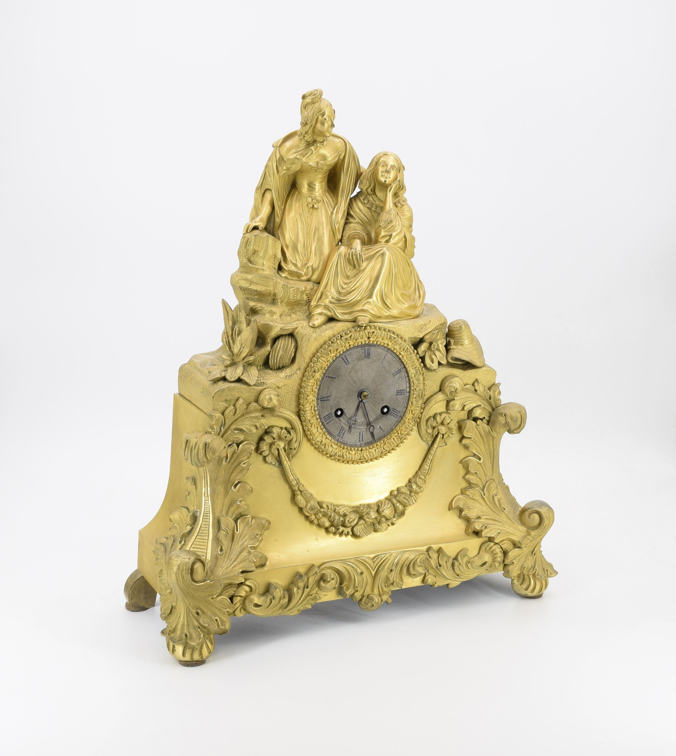 brąz złocony, mosiądz, stal, tarcza zegara z rzymskimi cyframi, srebrzona, mechanizm (sprawny), wys. całkowita 43 cm; szer. 35 cm;