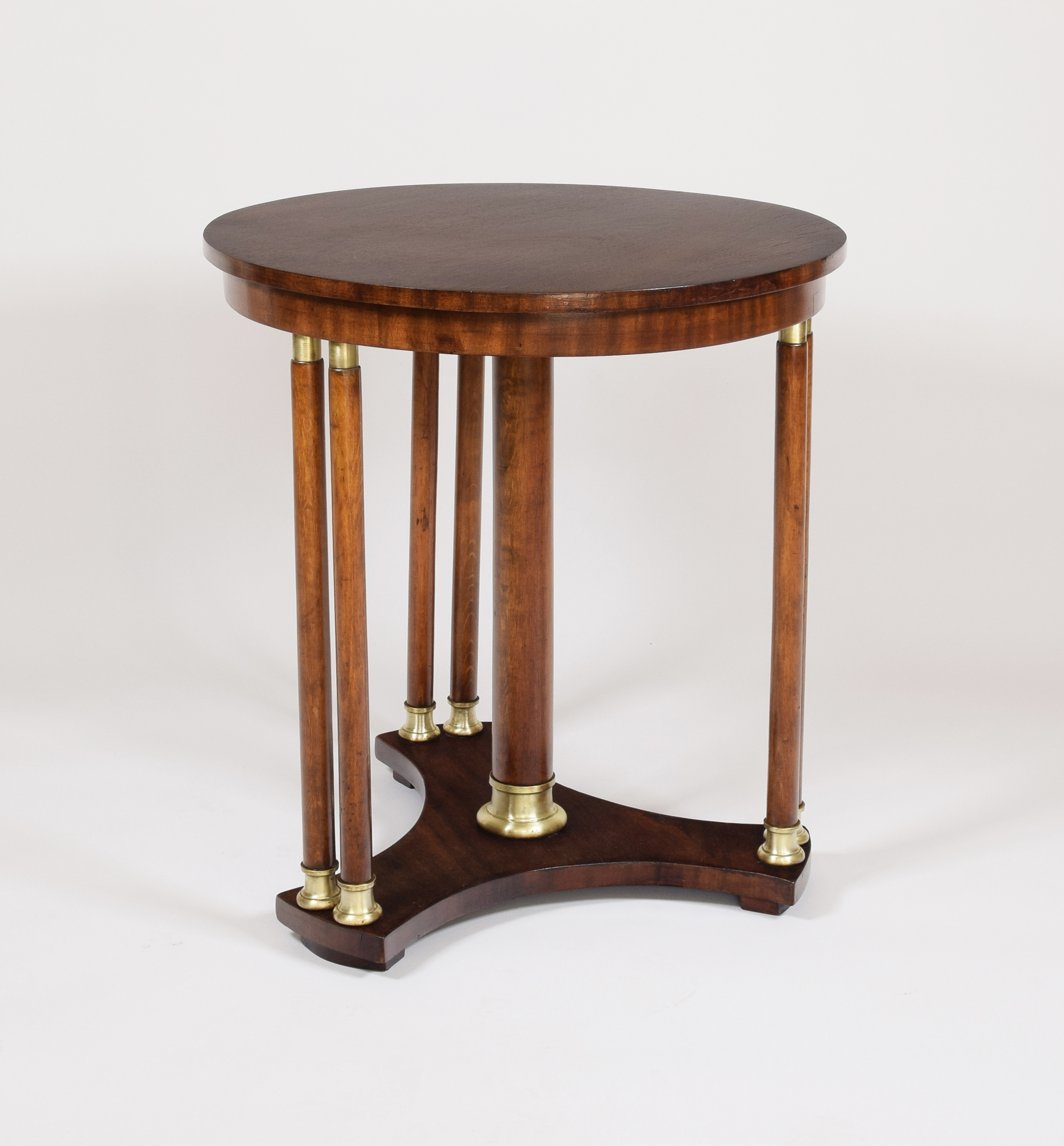 konstrukcja - orzech, drewno owocowe, fornir - mahoń, mosiądz; wys. 77 cm, śred. blatu 58 cm.