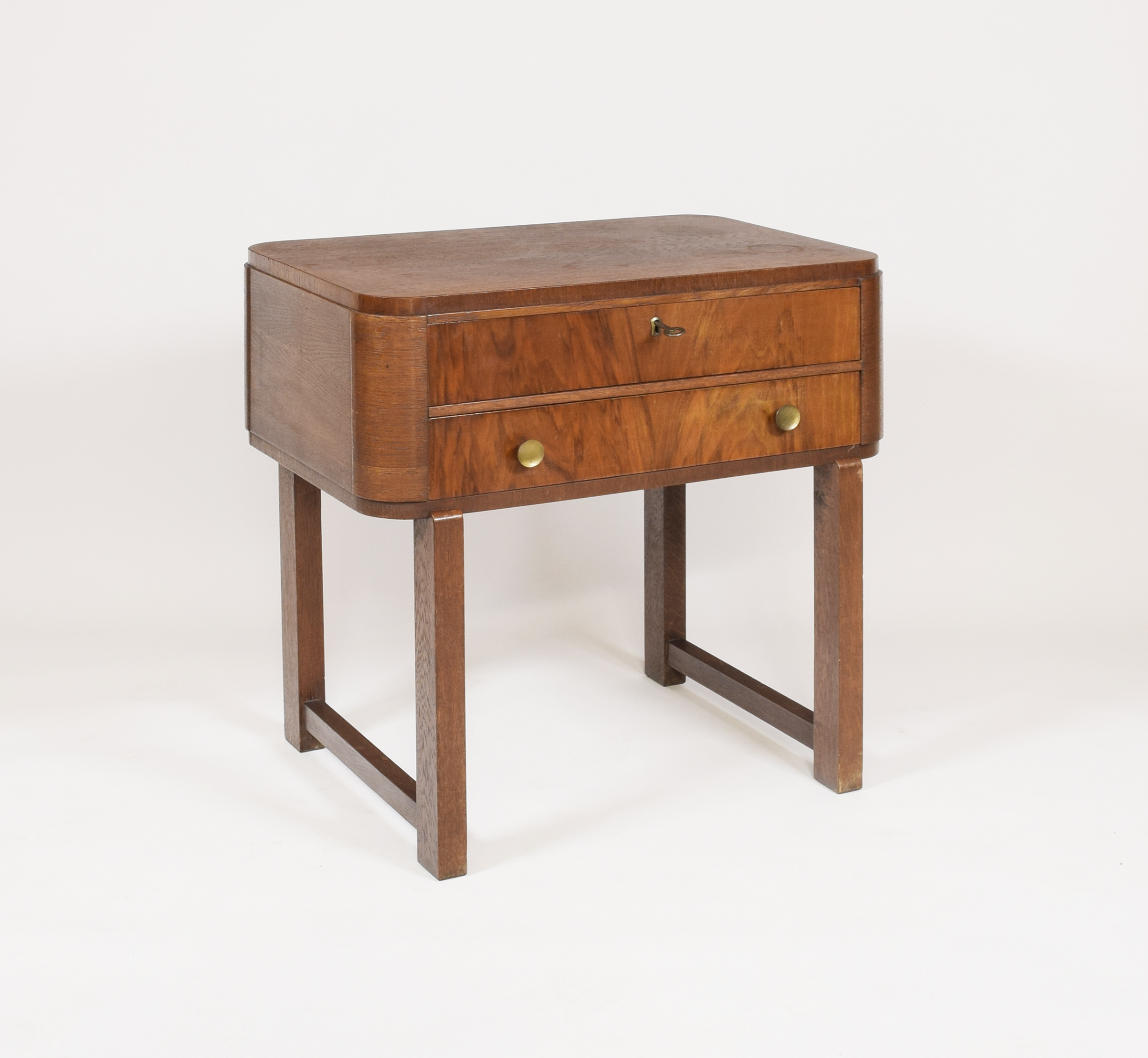konstrukcja - buczyna, sosna; fornir - orzech, dębina; mosiądz; wys. 66,5 cm; szer. 65 cm, głęb. 42 cm.