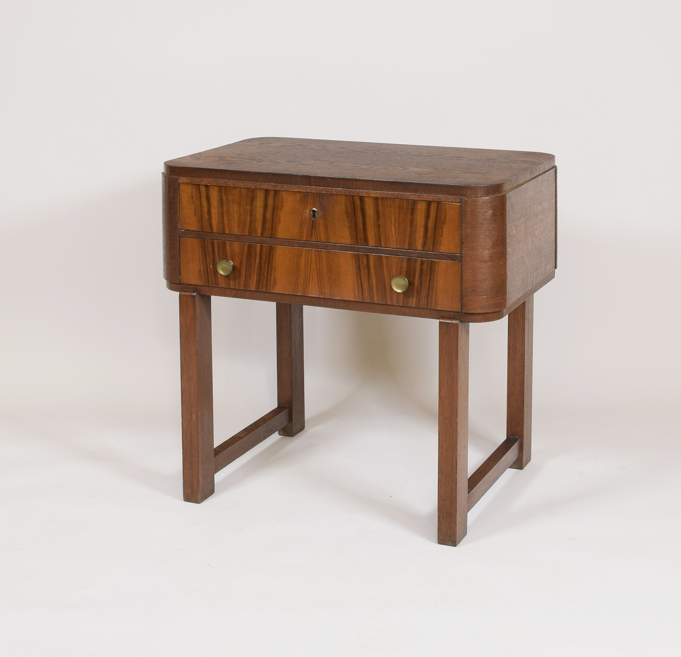 konstrukcja - buczyna, sosna; fornir - orzech, dębina; mosiądz; wys. 66,5 cm, szer. 65 cm, głęb. 42 cm.