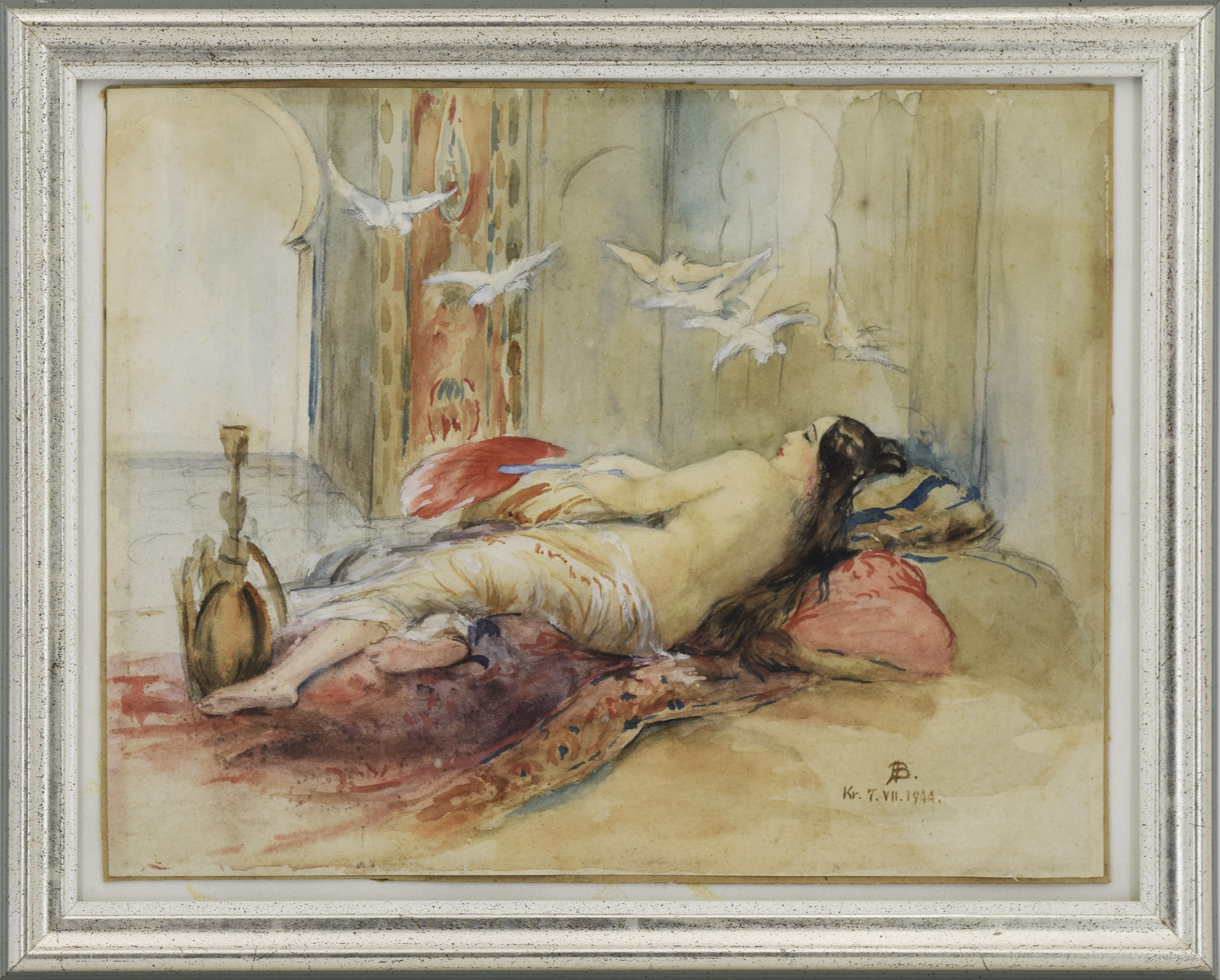 akwarela na podrysowaniu ołówkiem, gwasz w bielach, papier naklejony na tekturę; 17,5 x 22,5 cm;