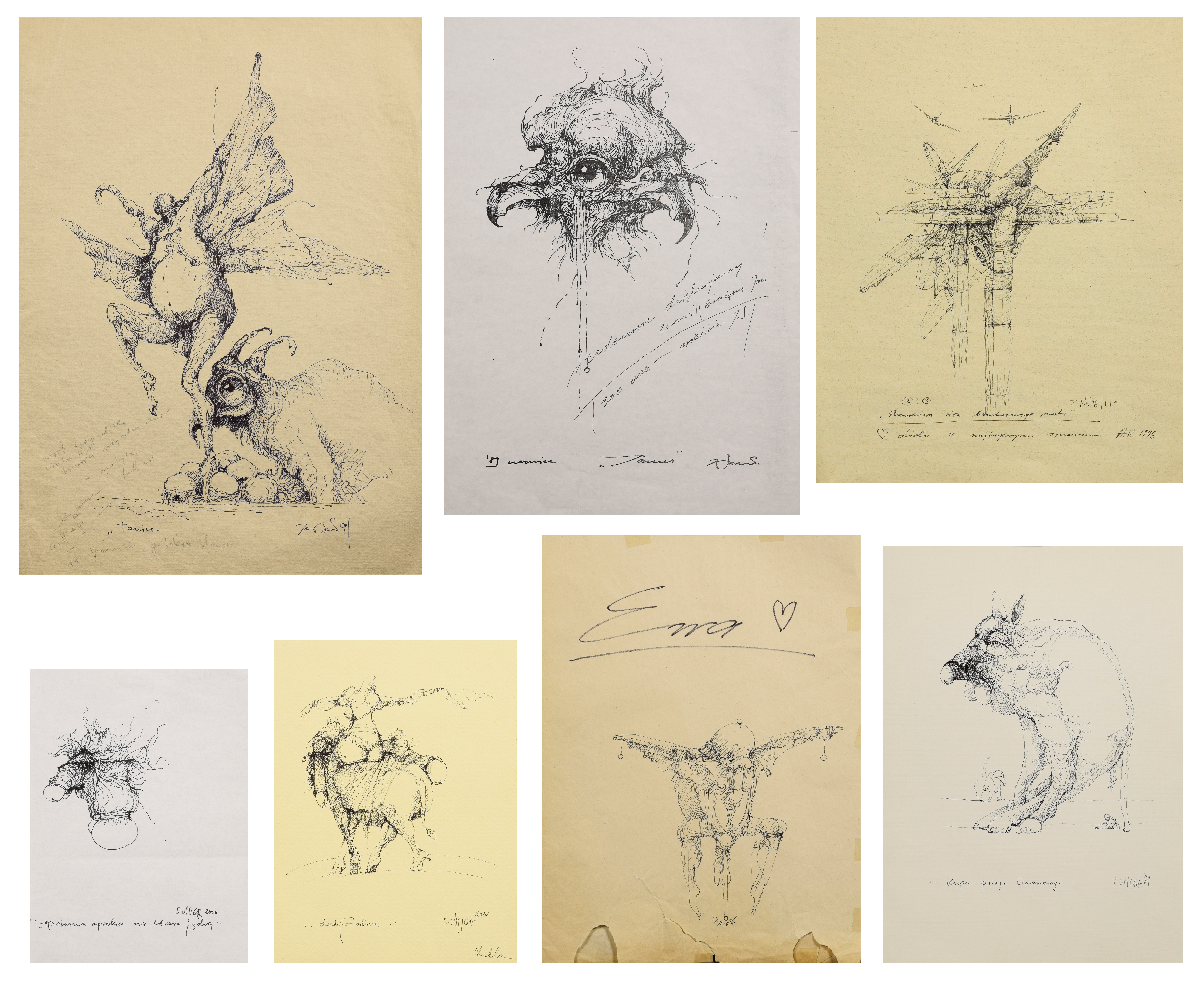 piórko, tusz, papier; wymiary różne (od 21 x 13 cm do 49 x 35 cm);