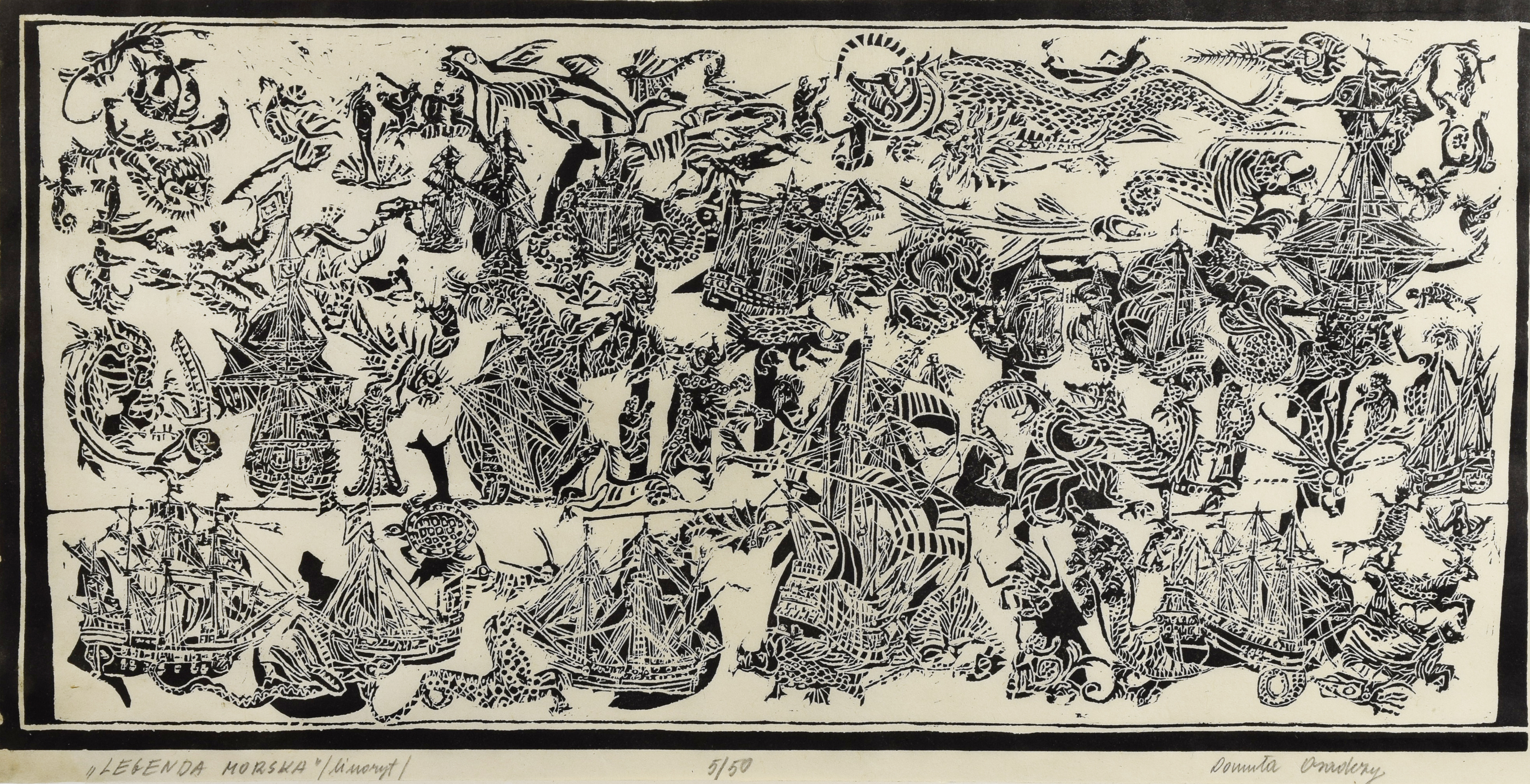 sygn., dat. i opisany u dołu: "LEGENDA MORSKA"/ linoryt / 5/50, Danuta Osadczy (ołówkiem).